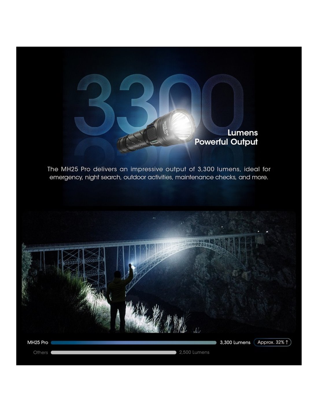 Die Linterna NITECORE MH25PRO ist ein Hochleistungswerkzeug, das für Profis entwickelt wurde, die leistungsstarke und zuverlässige Beleuchtung benötigen. Mit einer maximalen Leistung von 3.300 Lumen und einer beeindruckenden Reichweite von 705 Metern ist diese Linterna für die anspruchsvollsten Bedingungen ausgestattet. Ihr wiederaufladbarer Akku von 5.300mAh bietet bis zu 650 Stunden Betrieb, während der Ladeanschluss USB-C eine schnelle und bequeme Aufladung gewährleistet.