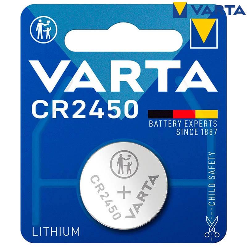 CR2450-Batterie der Marke Varta aus Lithium, Knopfmodell mit einer Spannung von 3V. Premium-Serie, die eine Lagerung von über 10 Jahren ermöglicht. Verwendet in Autoschlüsseln, Taschenrechnern, Kameras und anderen Geräten, die diese CR2450-Batterie benötigen.
