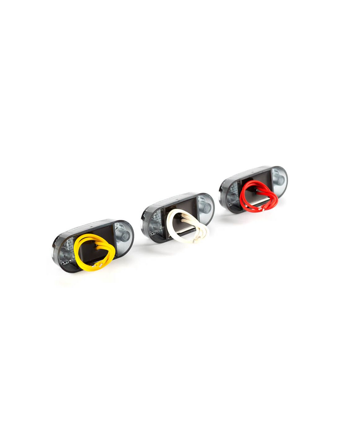 Mini Galibo LED Blinker FT-062 Dark homologiert mit Galibo A, R1 und SM1, vollständig wasserdicht und tauchfähig, das Gehäuse ist transparent rauchig in drei Farben, orange, rot und weiß.