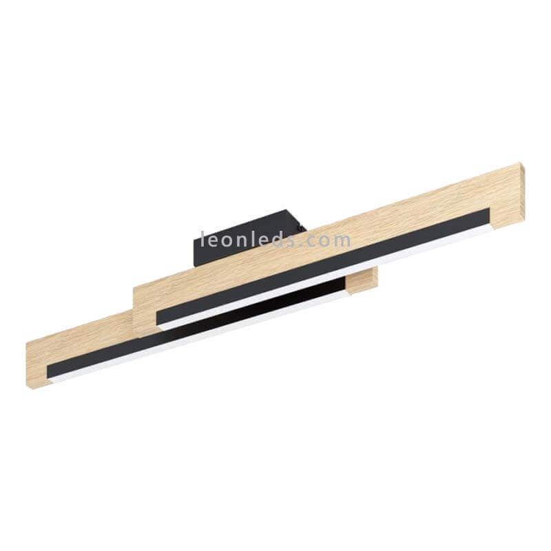Die minimalistische Camacho LED-Deckenplatte aus Holz von Eglo Beleuchtung. Sie ist mit einer mattschwarzen Stahl-Deckenhalterung und zwei angrenzenden Holzplatten in extraflacher Form mit einer horizontalen Stahlreihe gestaltet, die den Lichtdiffusor enthält.