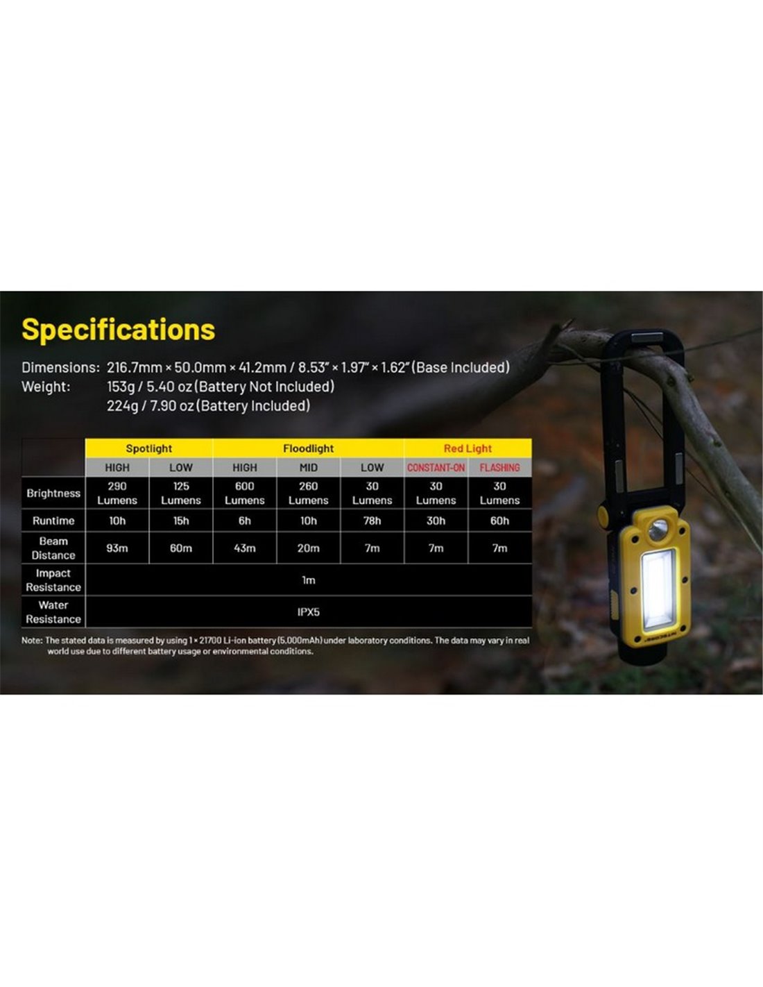 Die NWL20 von NITECORE ist eine vielseitige Arbeitslampe, die starke und funktionale Beleuchtung für verschiedene Anwendungen bietet. Mit 600 Lumen Leistung, doppelter Lichtausgabe und einem wiederaufladbaren 21700 Akku von 5.000 mAh kombiniert sie Leistung und Haltbarkeit in einem praktischen Design.