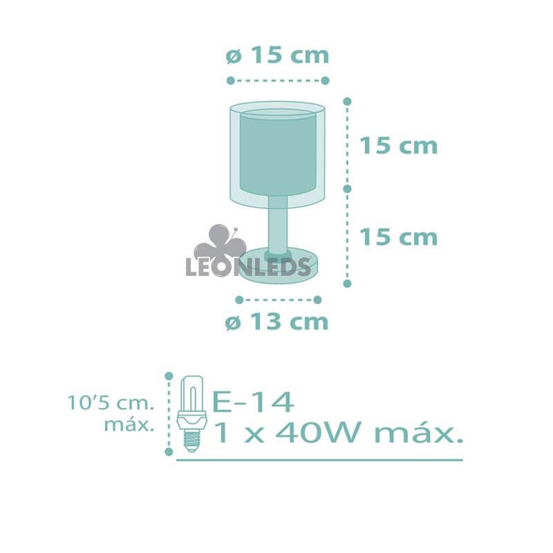 Der Schirm dieser Nachttischlampe für Kinder Dots ist rund mit einem Durchmesser von 13Cm und hat eine Gesamthöhe von 30Cm. An der Verbindung zur Struktur, die den Schirm hält, gibt es einen runden, türkisfarbenen Ring, der dieser Tischlampe einen noch kinderfreundlicheren Touch verleiht. Ihre Dekoration besteht aus weißen Punkten auf einem dominierenden türkisfarbenen Hintergrund im inneren Schirm. Ihr einfaches und modernes Design passt perfekt zu allen Arten von kinderfreundlicher Umgebung.