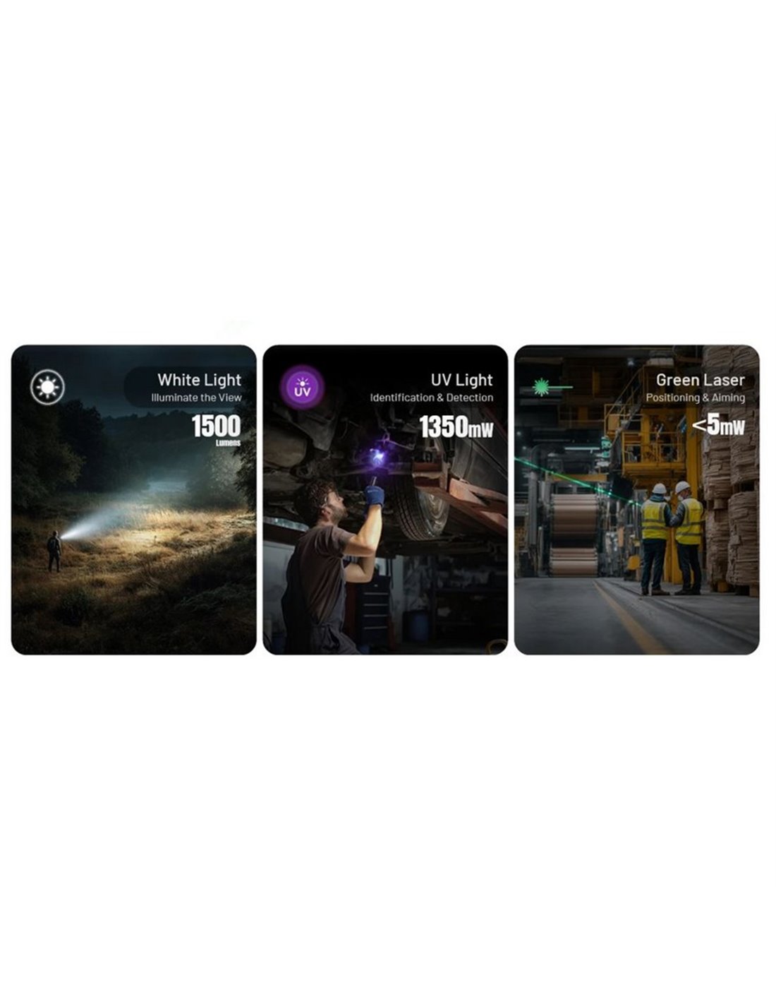Ideal für Fachkräfte in Wartung, Sicherheit, Industrieinspektion, Outdoor-Abenteuern oder täglichem Gebrauch. Ihr All-in-One-Design und die Steuerung über einen Schiebeschalter machen sie zu einem vielseitigen, kompakten und zuverlässigen Werkzeug in jeder Umgebung.