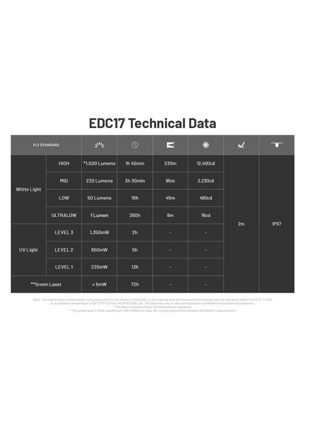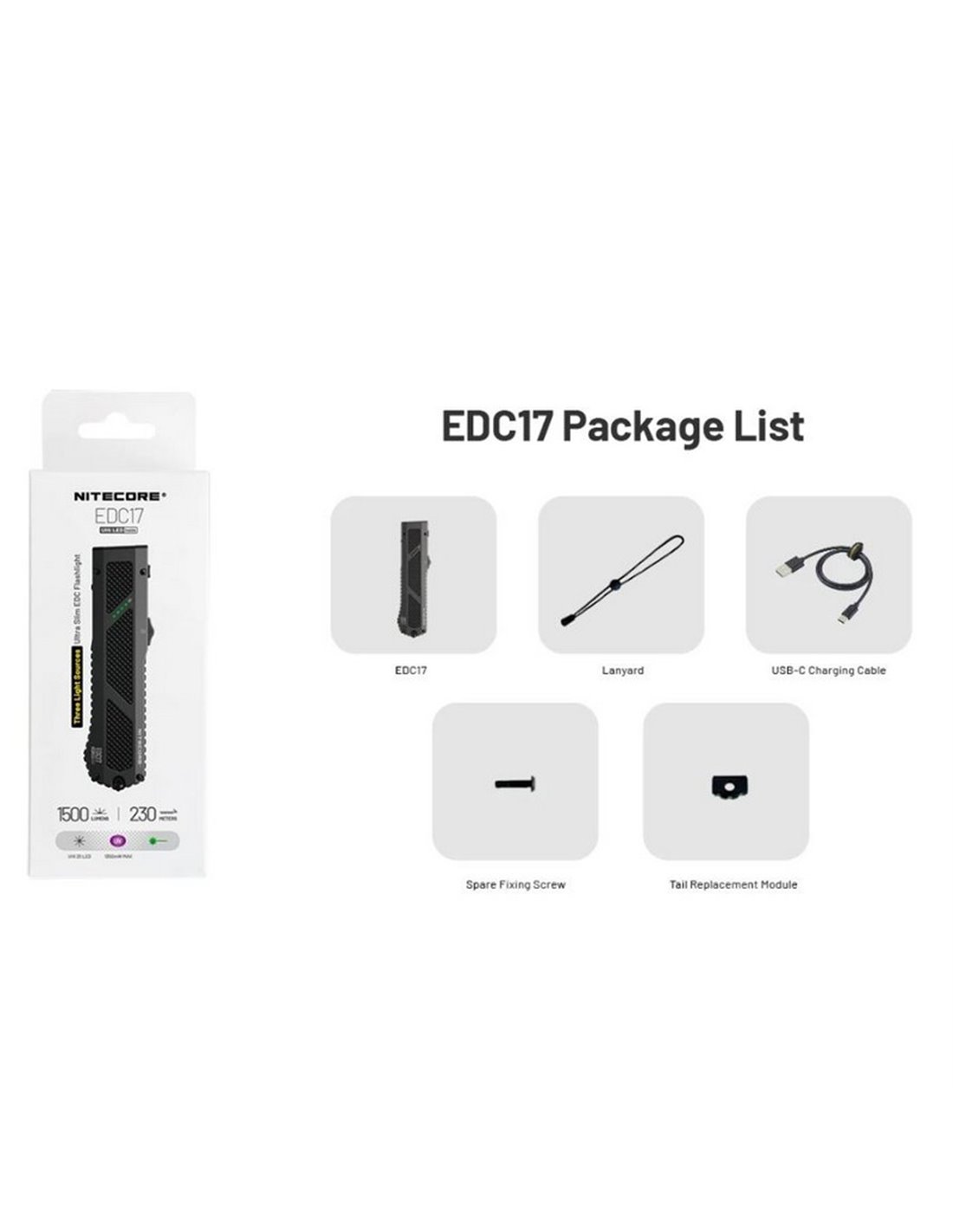 NITECORE EDC17 (Version 1R) ultra-dünn und multifunktional mit drei Lichtquellen: weißes Licht von 1500 Lumen, UV von 1350 mW und grüner Laser <5 mW. Ideal für den täglichen Gebrauch, UV-Detektion, Notfälle oder Wartung. Mit integriertem Akku von 1500 mAh, bietet sie bis zu 260 Stunden Laufzeit und USB-C-Aufladung.