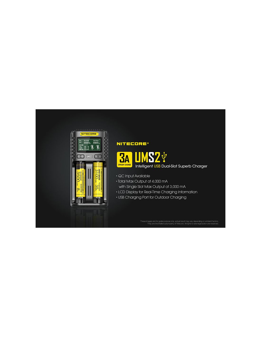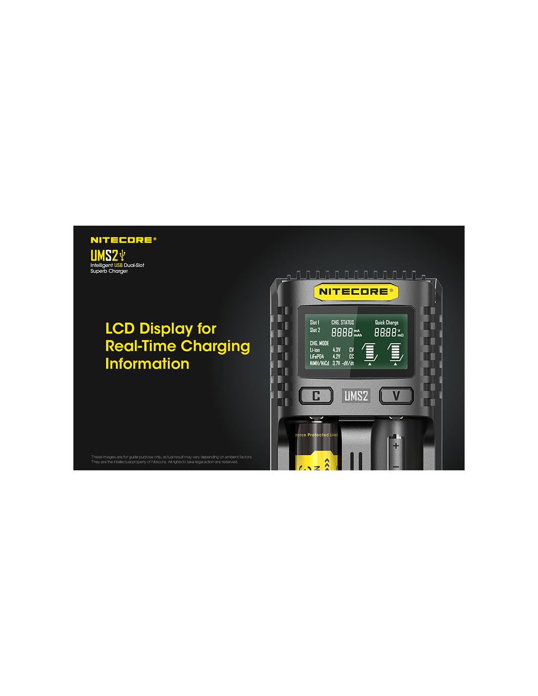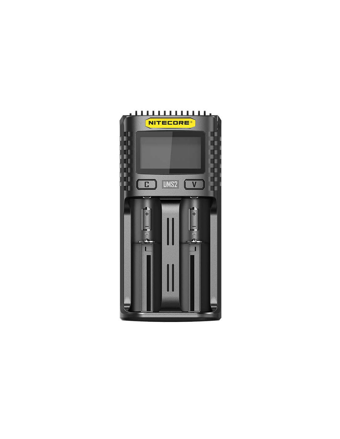 Nitecore Batterieladegerät Modell UMS2, das das gleichzeitige Laden von 2 Batterien mit einem LCD-Ladeanzeiger ermöglicht.