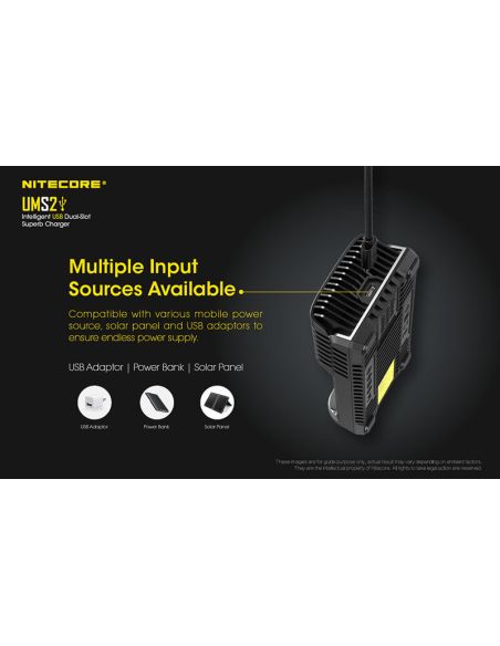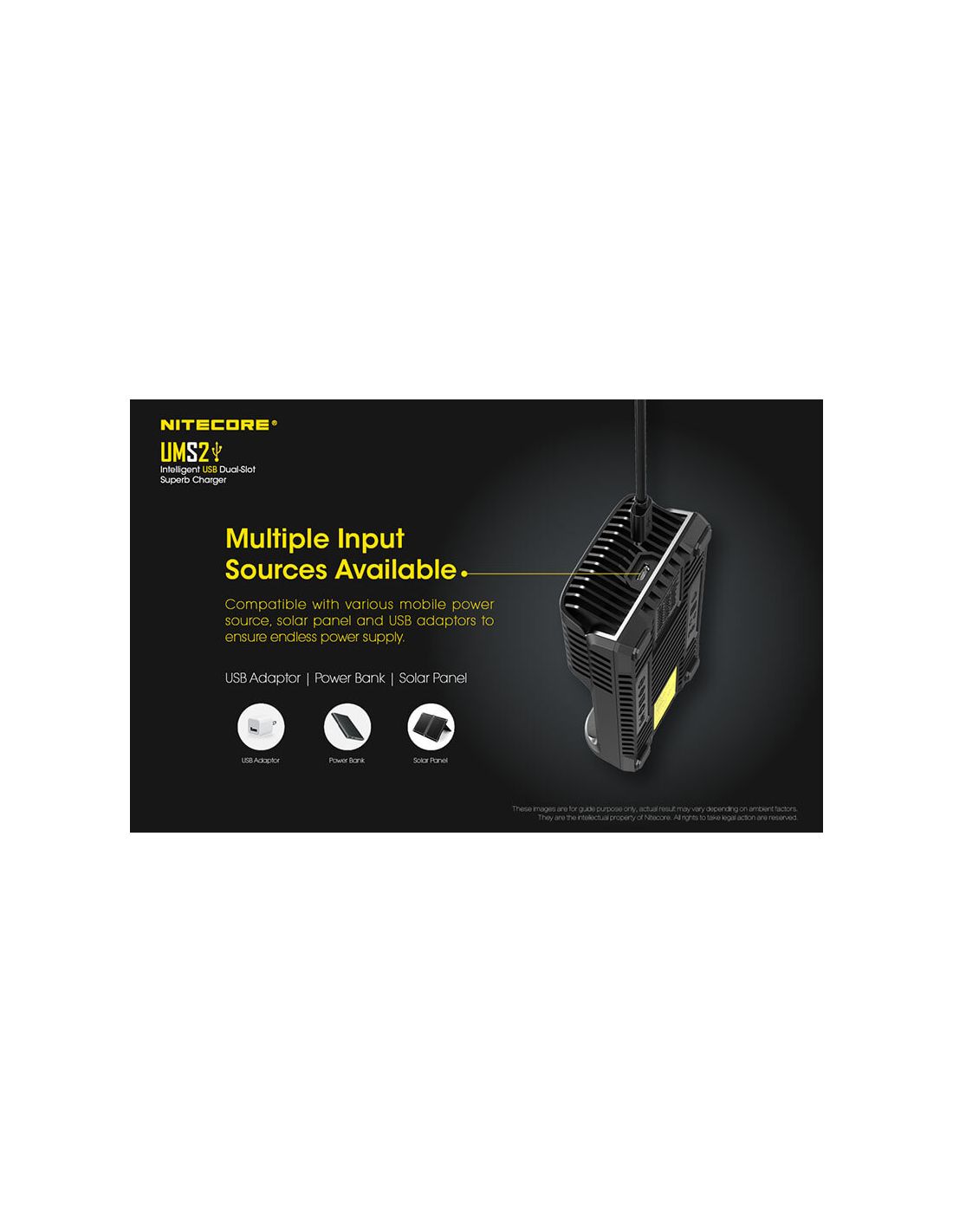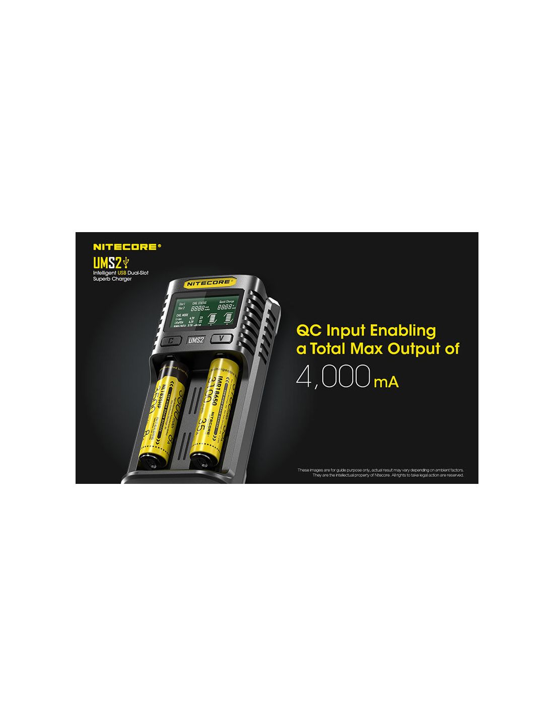Nitecore Batterieladegerät Modell UMS2, das das gleichzeitige Laden von 2 Batterien mit einem LCD-Ladeanzeiger ermöglicht.