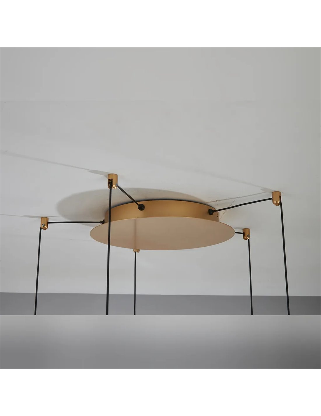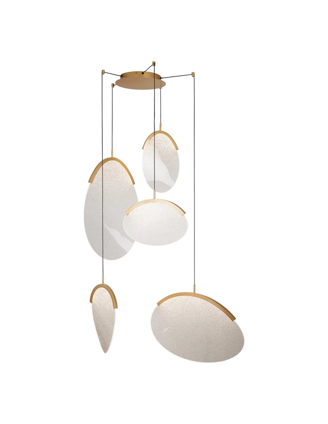 Die OASIS 5-flammige Pendelleuchte vereint zeitgenössisches Design und Eleganz und ist damit ideal für moderne Räume. Ihre goldene Oberfläche und die mehrflammige Konstruktion verleihen ihr einen anspruchsvollen und harmonischen Stil.