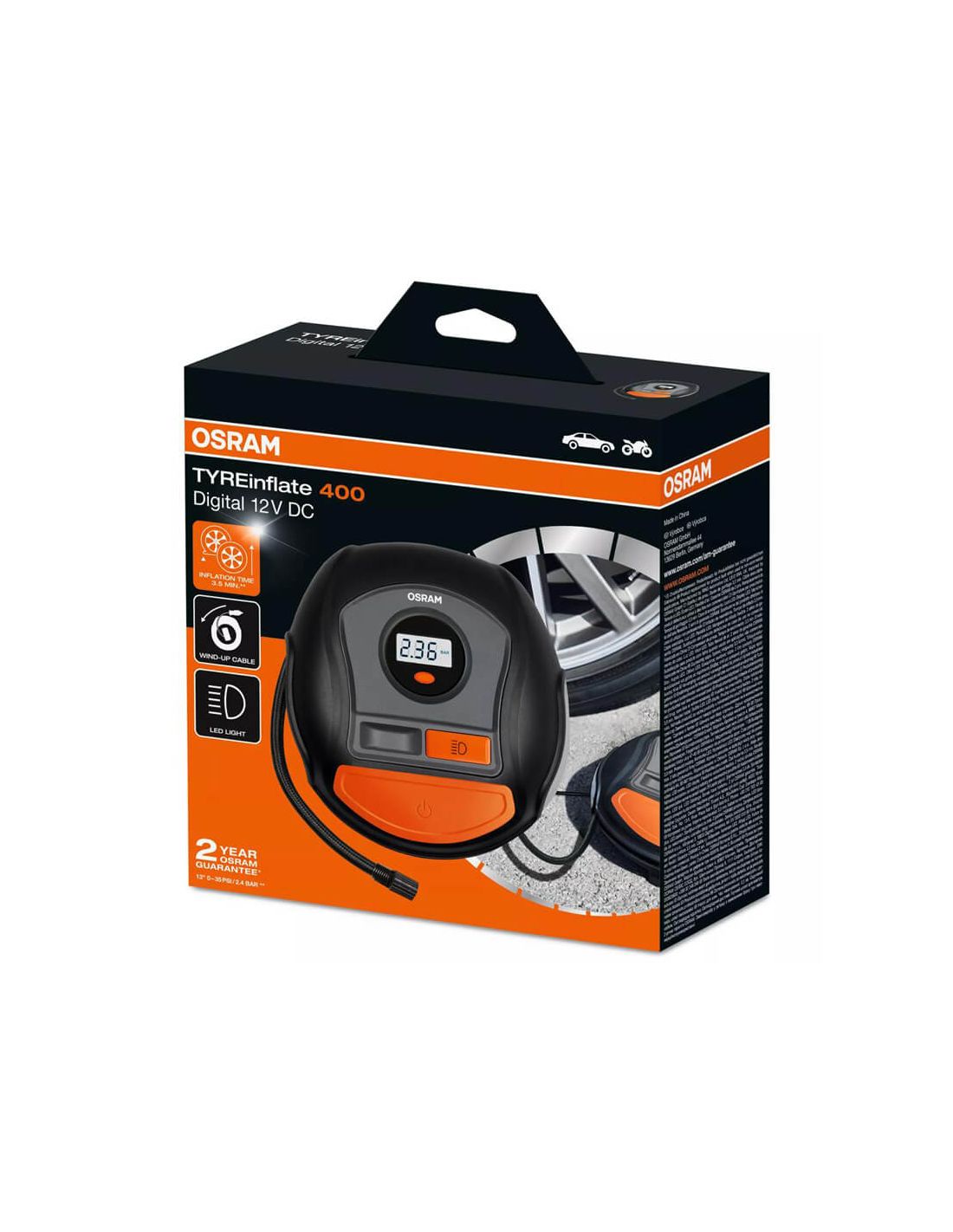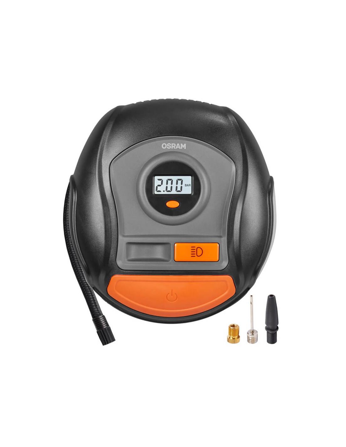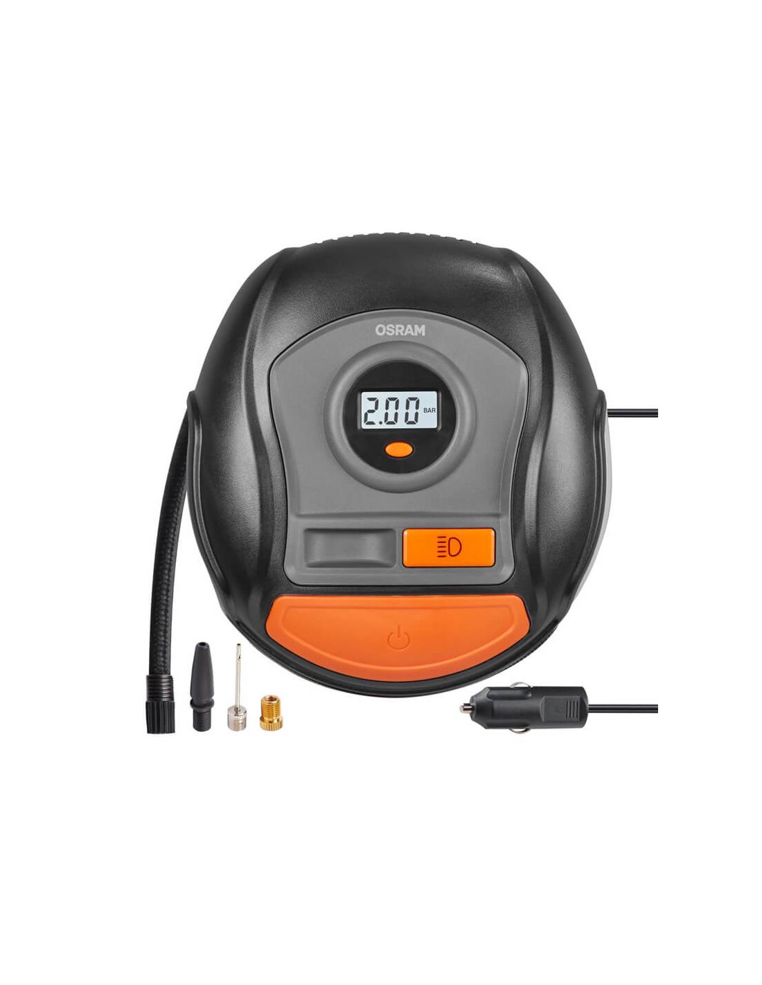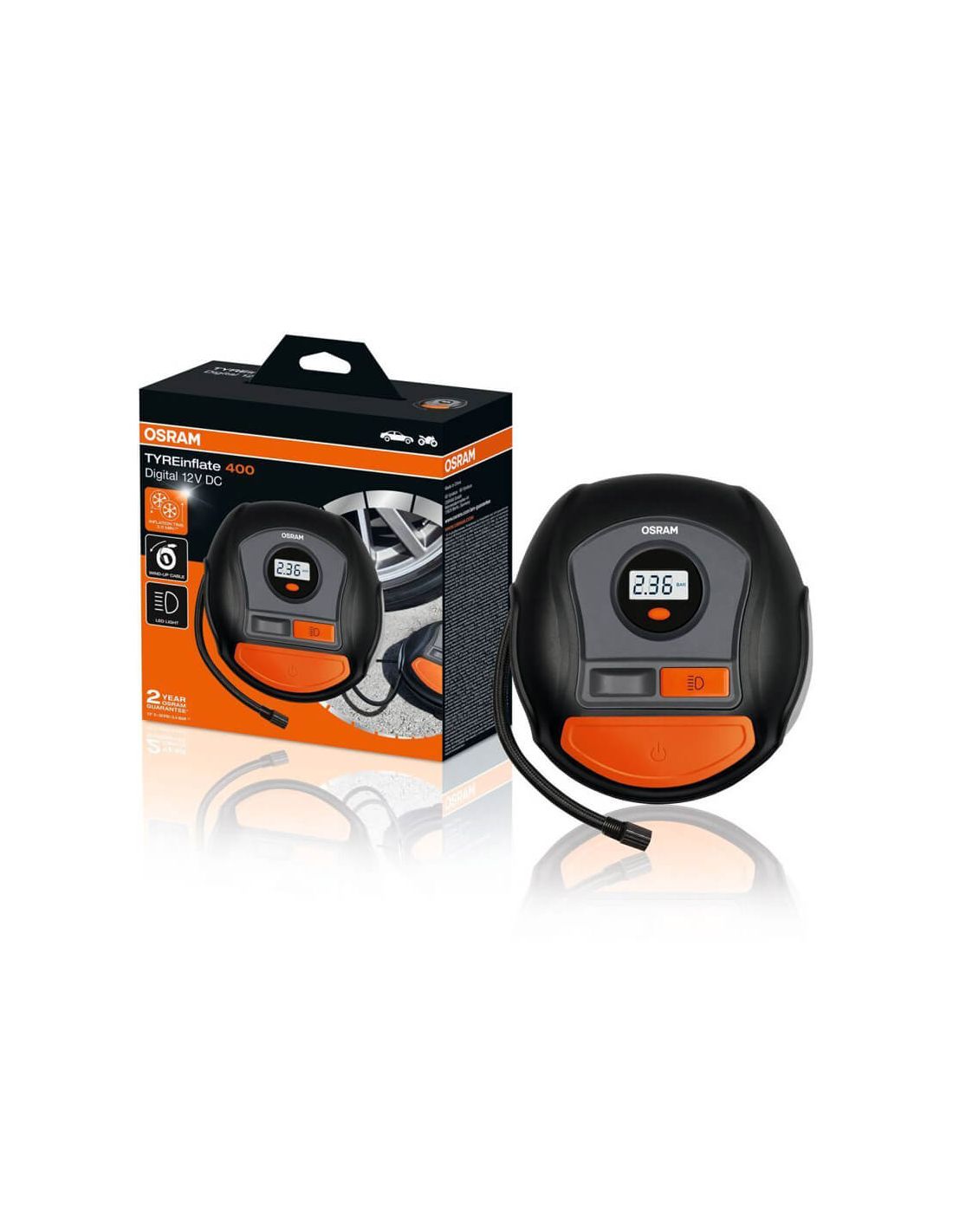 Der OSRAM Tyreinflate 400 OTI400 ist ein digitaler Reifenaufbläser mit 12V, mit hintergrundbeleuchtetem LED-Display, Aufblasen in 3,5 Minuten und Präzision von ±0,1 bar. Adapter für Fahrräder, Bälle und Luftmatratzen sind enthalten.