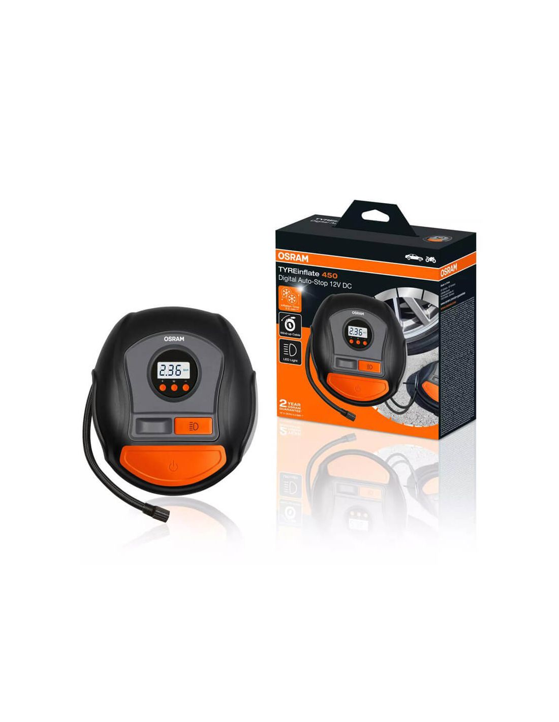 Der OSRAM TYREinflate 450 ist ein digitaler Reifenaufbläser mit automatischem Stopp, der einen Reifen in nur 3,5 Minuten aufpumpt. Hintergrundbeleuchtetes LED-Display, 3m Kabel und Adapter inklusive.