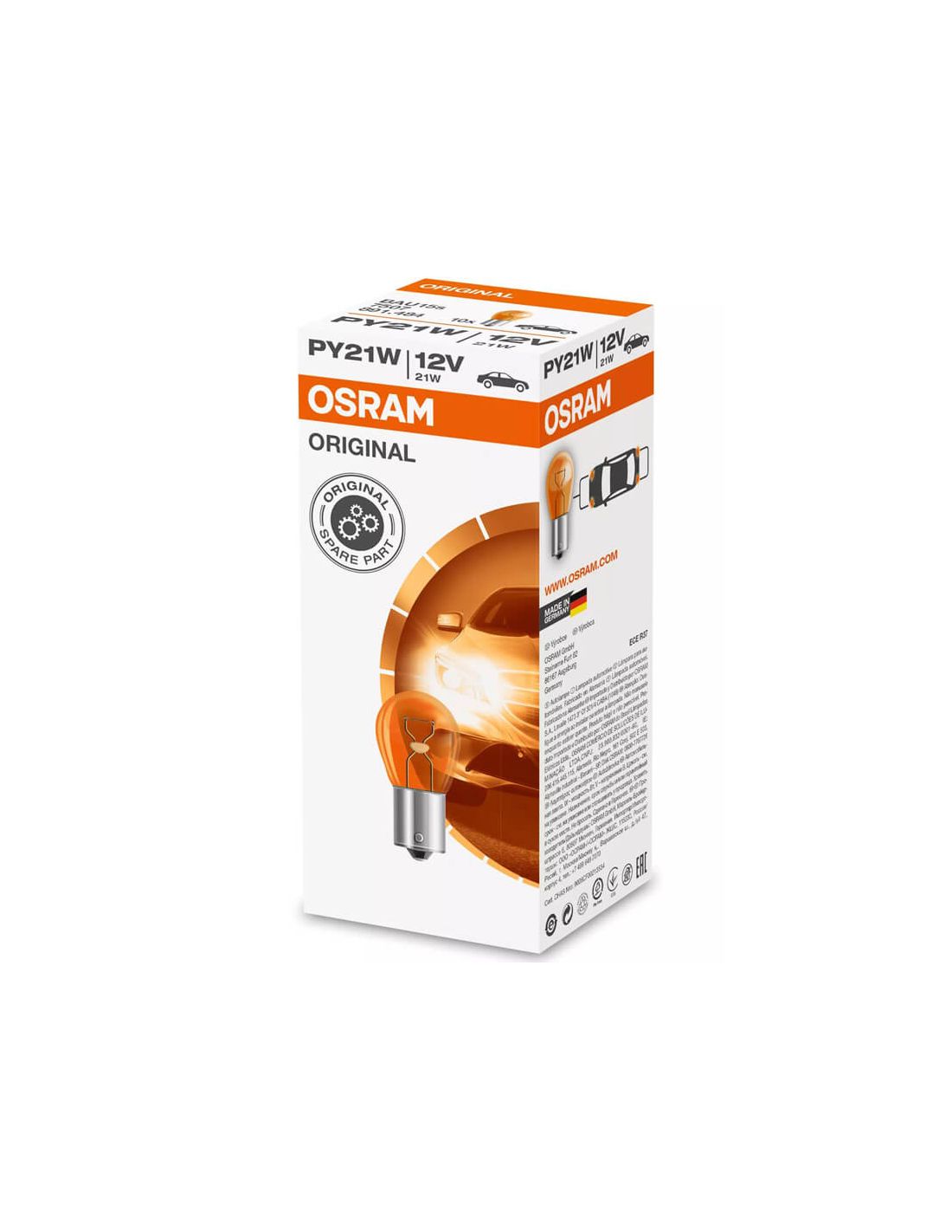 Birne OSRAM ORIGINAL PY21W mit amber Glas und metallischer BAU15s-Basis, geeignet für Blinker 12V. Zuverlässige OEM-Qualität, homologiert ECE E1. Einzelverpackung, ideal zum Austausch der defekten Birne.