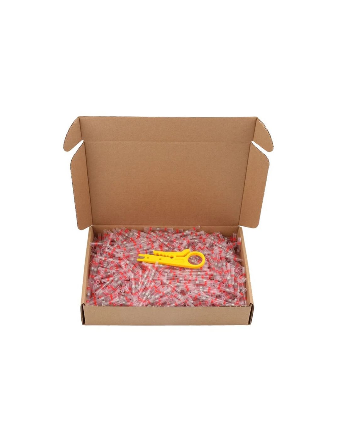 Pack mit 100 marinen Schrumpfverbindungssteckern in Rot. Ideal für große Verkabelungsprojekte, die wasserdichte und widerstandsfähige elektrische Verbindungen erfordern. Geeignet für Kabelquerschnitte von 0,5mm bis 1,5mm2.
