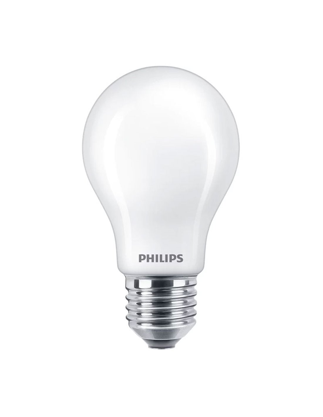 Pack von 2 Philips LED Glühbirnen im Format A60 mit Sockel E27 und einer Leistung von 10,5W (entspricht 100W). Diese Glühbirnen aus mattem Glas bieten 1521 lm von warmweißem Licht 2700K, EyeComfort und sofortiges Einschalten (<0,5 s). Nicht dimmbar, CRI 80, Leistungsfaktor 0,52 und eine Lebensdauer von 15.000 h (20.000 Einschaltungen). Maße pro Glühbirne: Ø60 × 104 mm (A60). EU-Energieklasse D (EPREL 387431, 11 kWh/1000 h). Direkter Ersatz zur stärkeren Beleuchtung in Wohnzimmern, Küchen oder Durchgangsbereichen.