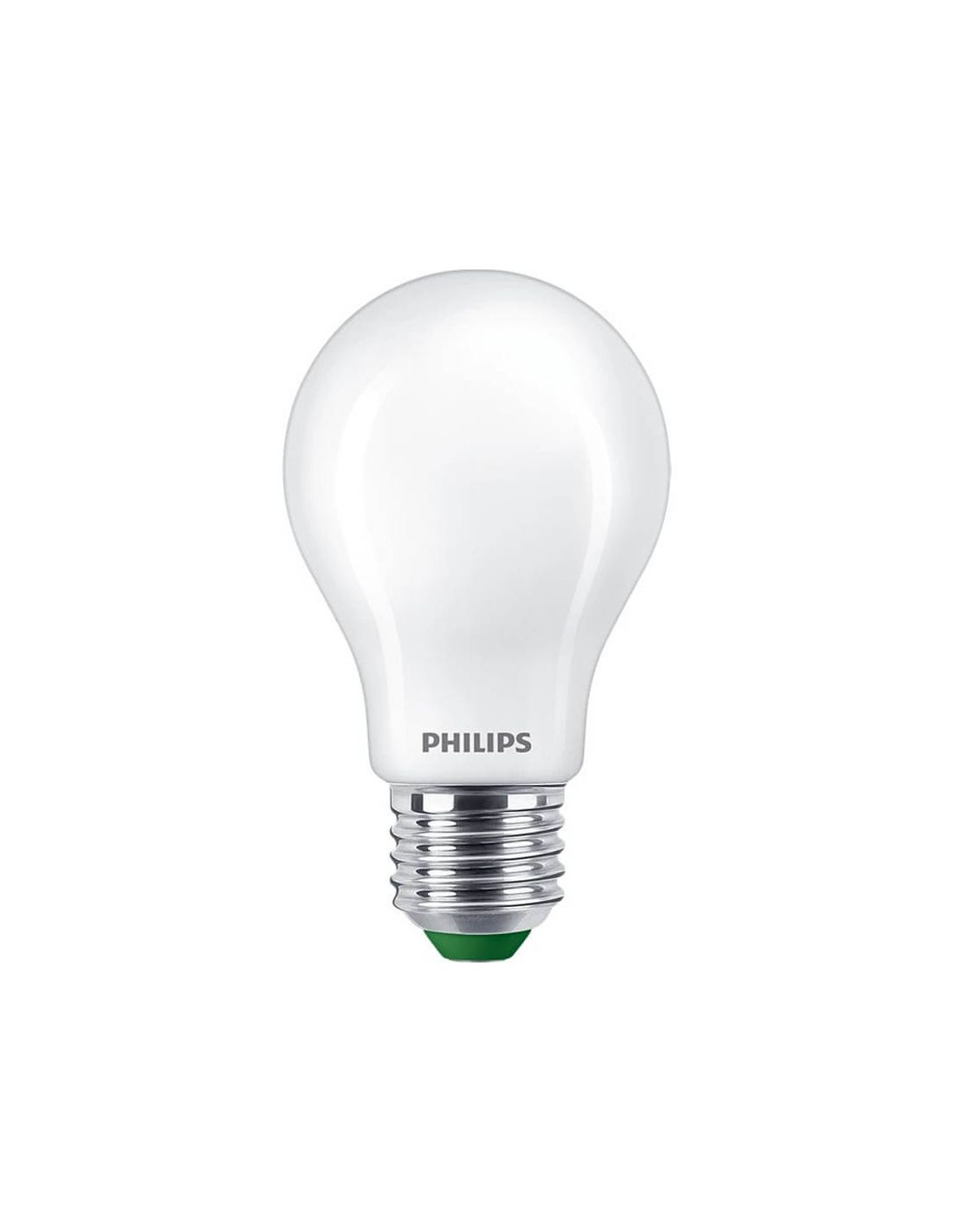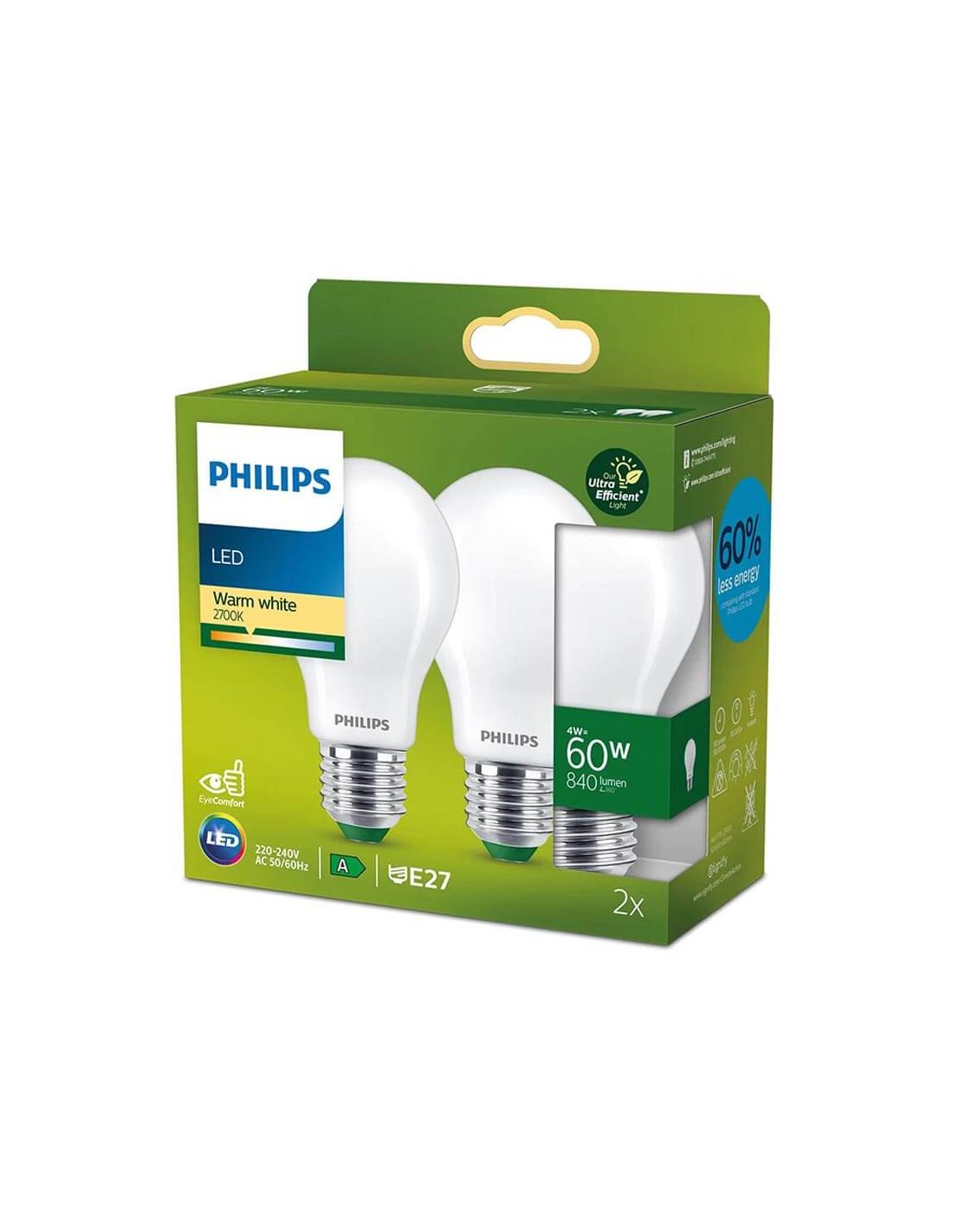 Pack mit 2 ultra-effizienten A60 LED-Glühbirnen aus weißem Glas mit einer Leistung von 4W, was 60W einer herkömmlichen Glühbirne entspricht und einer Helligkeit von 840Lm. Hat eine Lebensdauer von 50.000 Stunden und 50.000 Ein-Aus-Zyklen, Philips bietet eine Garantie von 2 Jahren.