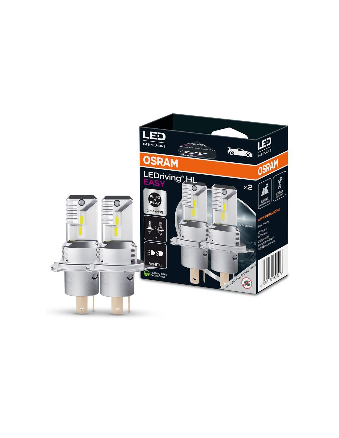 LED-Lampen H4 / H19 Osram HL EASY mit der Referenz 64193DWESY in einer Farbtemperatur von 6500K Kaltweiß mit einer Intensität von 1.400Lm/1.100Lm und einer Leistungsaufnahme von 18W/19W, sie ist heller als herkömmliche Halogenlampen, die Lampe ist für Abblend- und Fernlicht geeignet und gültig für H4 und H19 mit dem gleichen Sockel. Neue Serie von Osram, keine Adapter oder Gummikappen erforderlich. Neue Kunststoffverpackung, Plastic Fee.