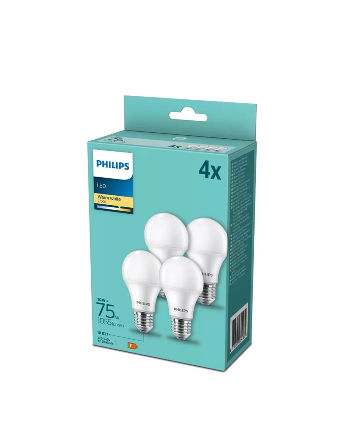 Pack mit 4 Philips LED-Lampen im A60-Format mit E27-Sockel, äquivalent zu 75W Glühlampen. Diese Lampen aus opakem Glas bieten 1055 lm von warmem 2700K Licht, sofortige Einschaltung und Lebensdauer von 15.000 h. Nicht dimmbar, nominelle Leistung von 10–10,5 W und Leistungsfaktor 0,54. Breite Öffnung für die Allgemeinbeleuchtung im Wohnzimmer, Schlafzimmer, Fluren oder Küche. Direkter Austausch in E27-Leuchten mit der Ersparnis und Zuverlässigkeit von Philips LED.
