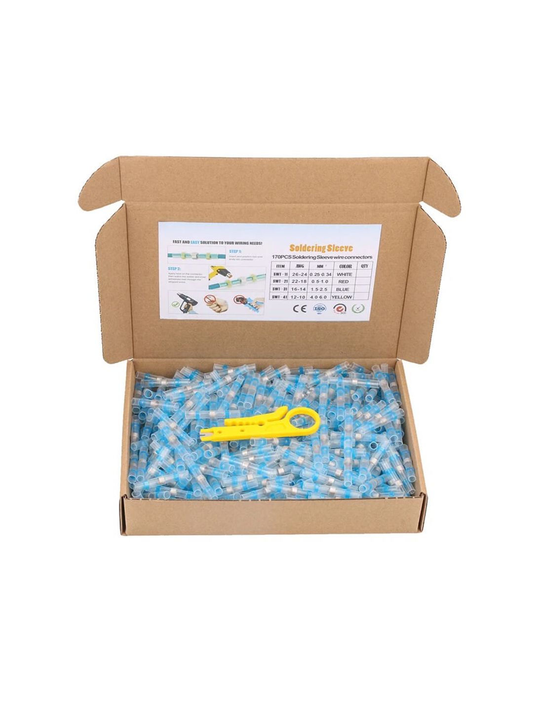 Pack mit 100 marinen Schrumpfverbindungssteckern in Blau. Ideal für große Verkabelungsprojekte, die wasserdichte und widerstandsfähige elektrische Verbindungen erfordern. Geeignet für Kabelquerschnitte von 1,5mm bis 2,5mm2.