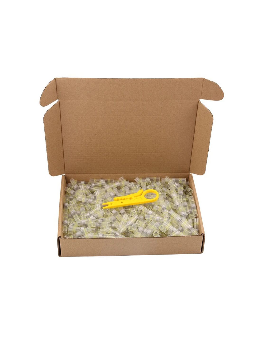 Box mit 100 marinen Schrumpfverbindungssteckern in Gelb. Ideal für große Verkabelungsprojekte, die wasserdichte und widerstandsfähige elektrische Verbindungen erfordern. Geeignet für Kabelquerschnitte von 4mm bis 6mm2.