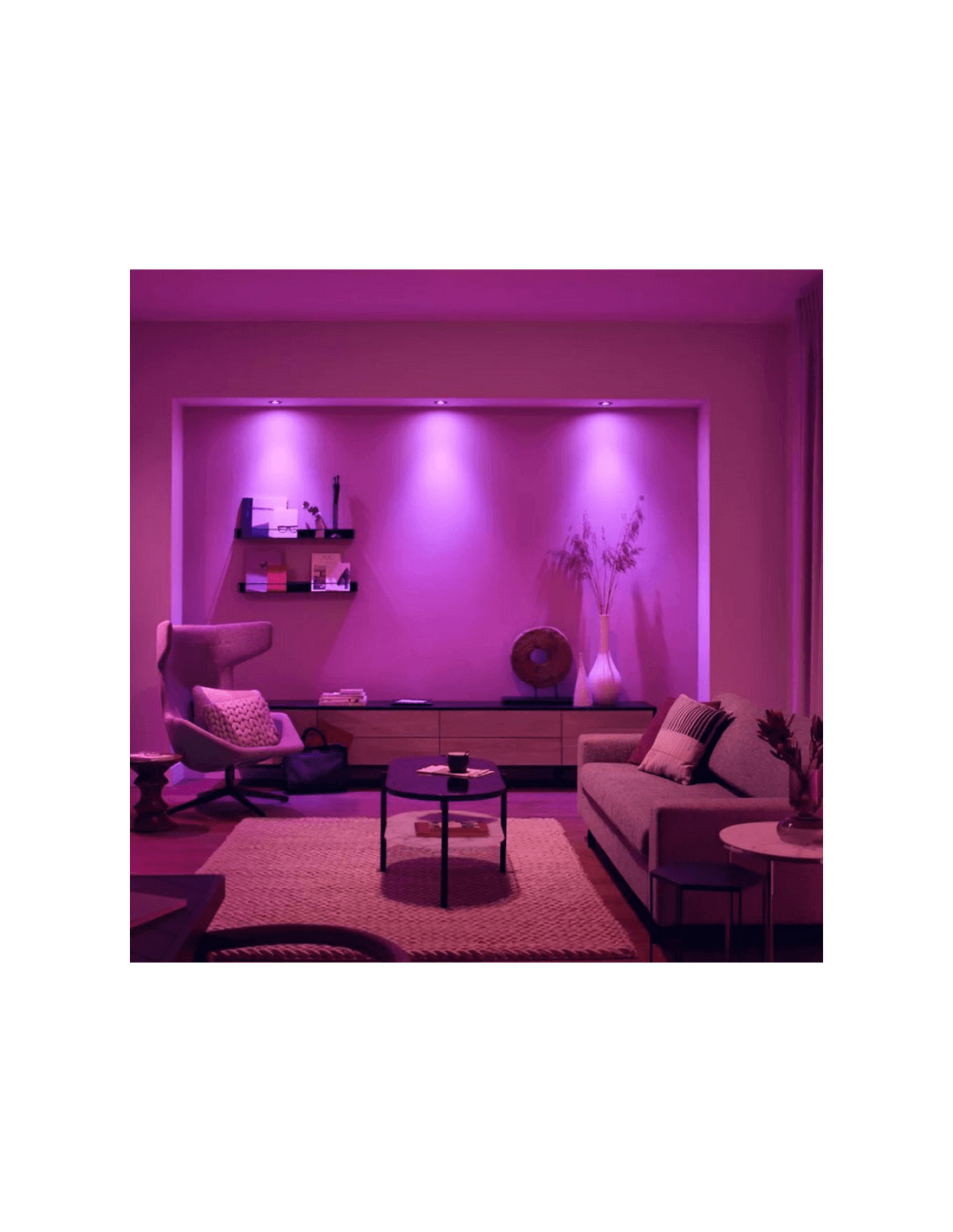 Dieses Angebot bietet verstellbare Strahlerköpfe, sowie die Lichtregelung über die App oder den Schalter. Sie bietet eine Farbtemperatur von 2.000K – 6.500K mit Hue White Color Ambiance und 1.050 Lumen mit 3 Lampen von 5,7W, die im Lieferumfang enthalten sind.