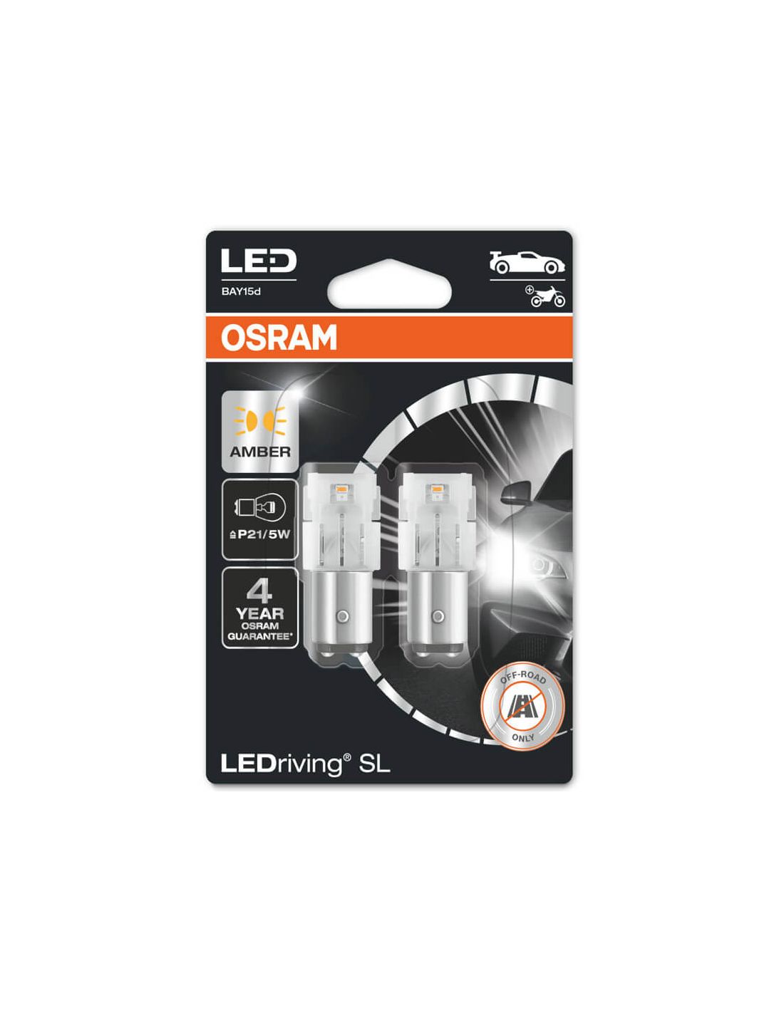 Neue P21/5W LED-Lampen von Osram mit Fassung BAY15d mit Amber-Licht, einer Leistung von 1,3W und 0,8W und einer Lichtintensität von 55Lm und 10Lm.