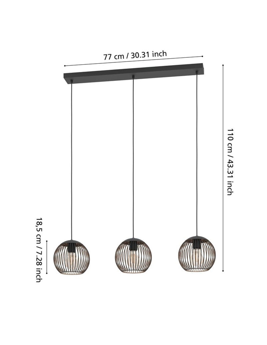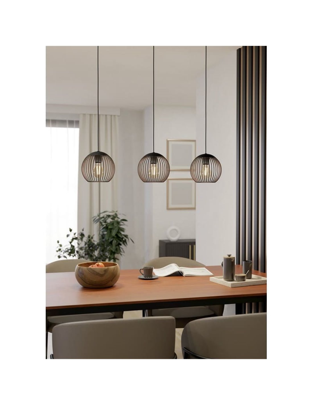 Die Pendelleuchte ALMANZORA mit 3 Lichtern kombiniert modernes industrielles Design mit warmer, umhüllender Beleuchtung. Ihre drei Metallschirme in Schwarz mit Innenkupfer schaffen einen perfekten dekorativen Brennpunkt für Esszimmer und offene Räume.