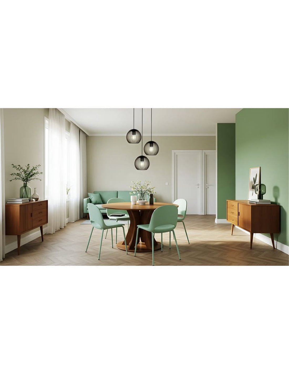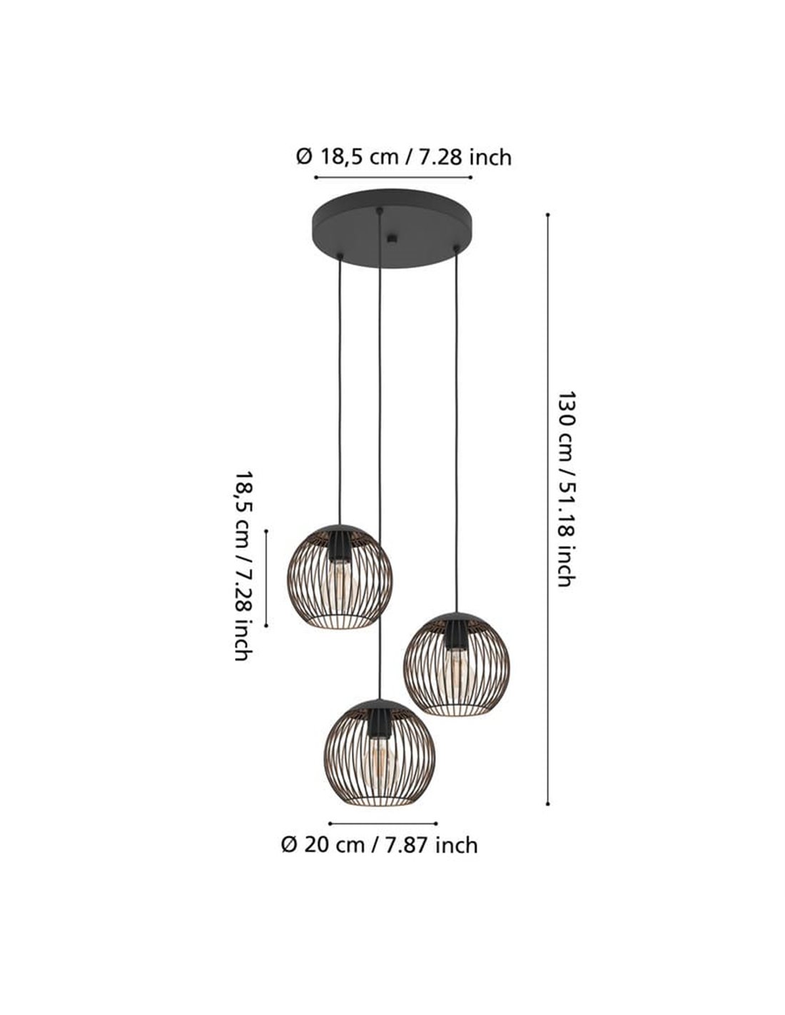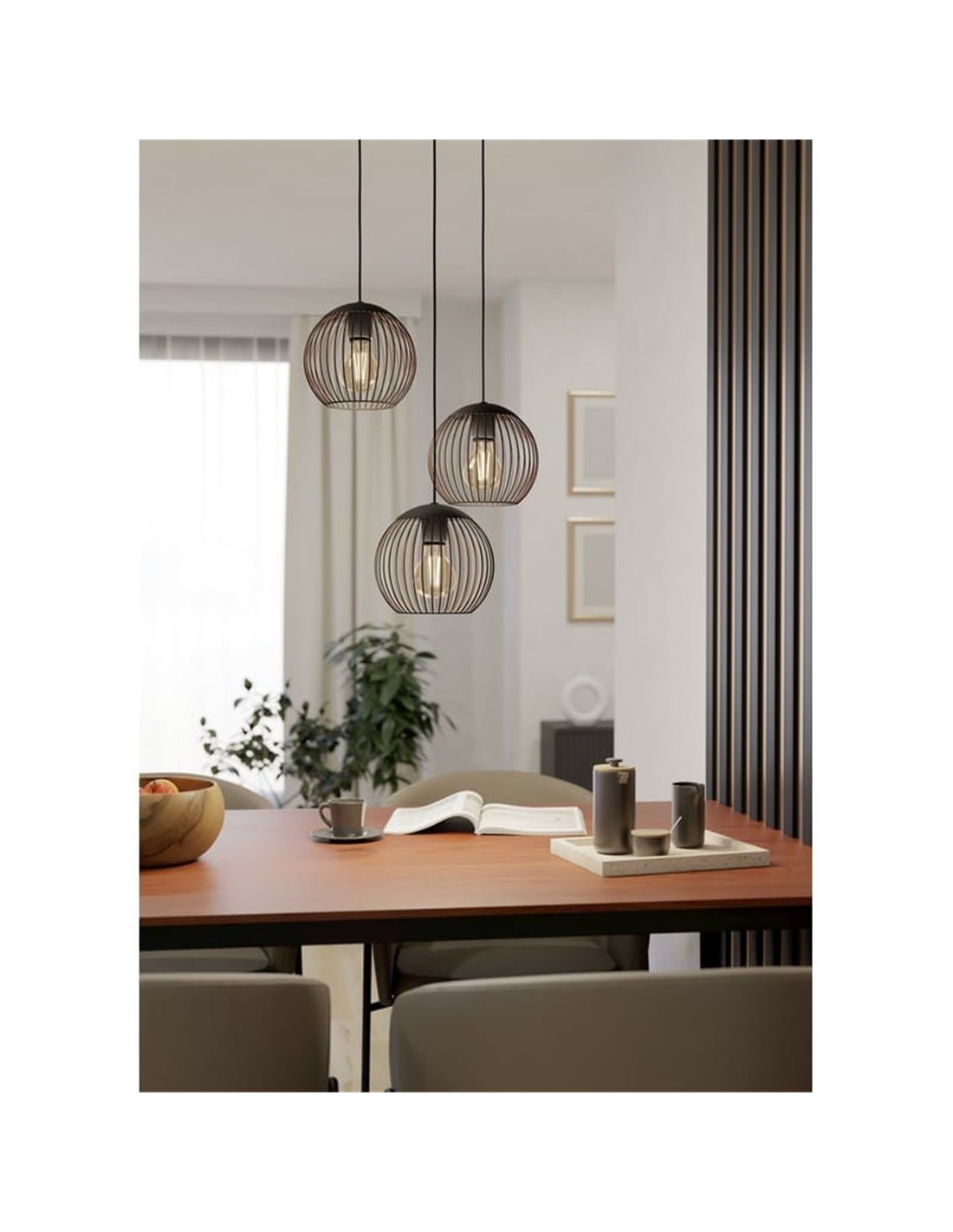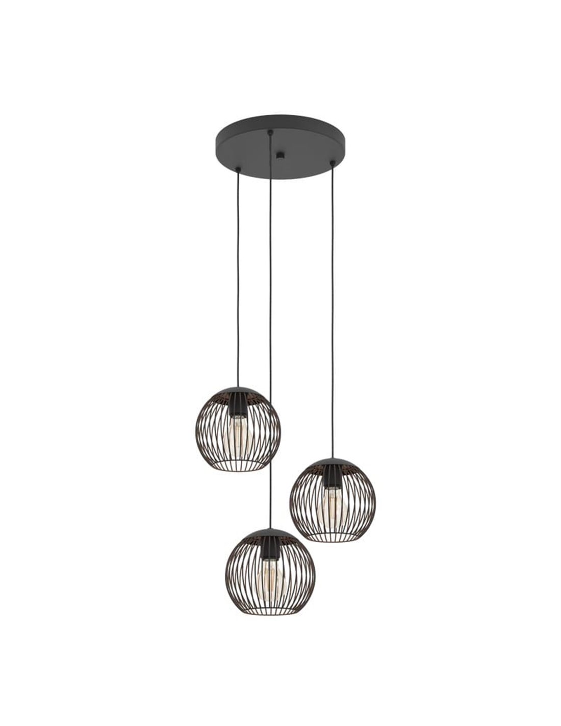 Die Pendelleuchte ALMANZORA mit 3 Lichtern mit runder Basis ist ein dekoratives Element, das dafür konzipiert wurde, Charakter und Stil in großzügige Räume zu bringen. Ihr industrielles Design mit Käfigschirmen in Schwarz und Kupfer macht die Beleuchtung zu einem zentralen Element.