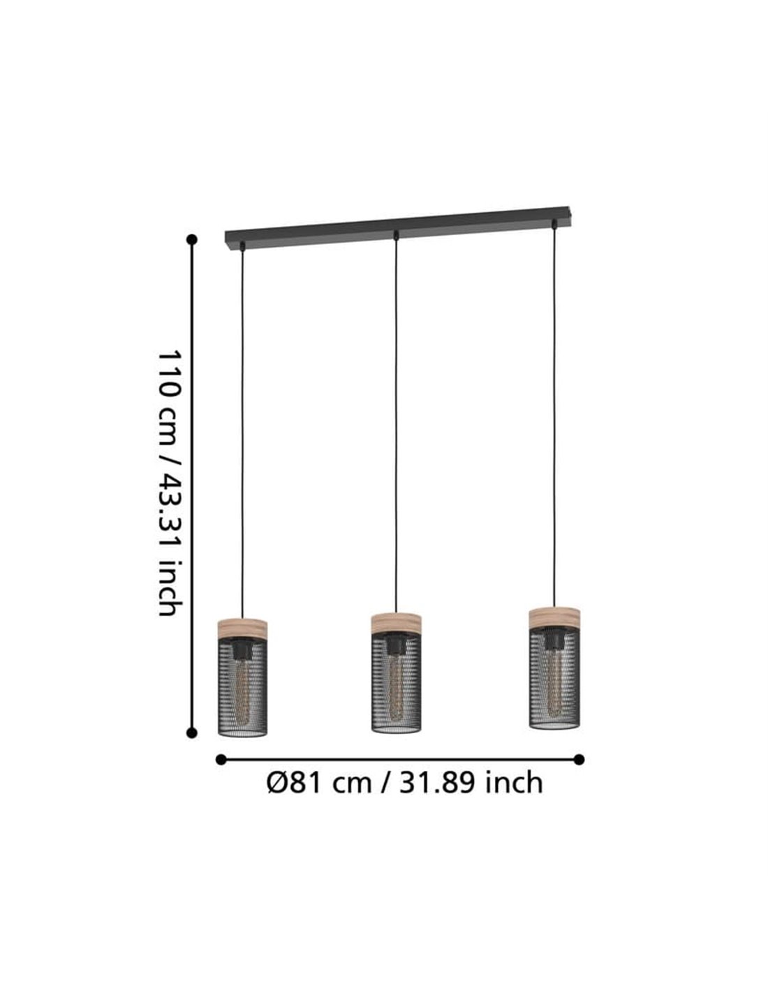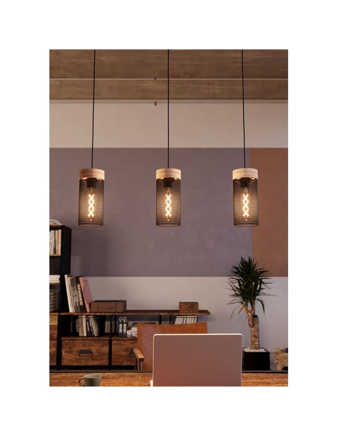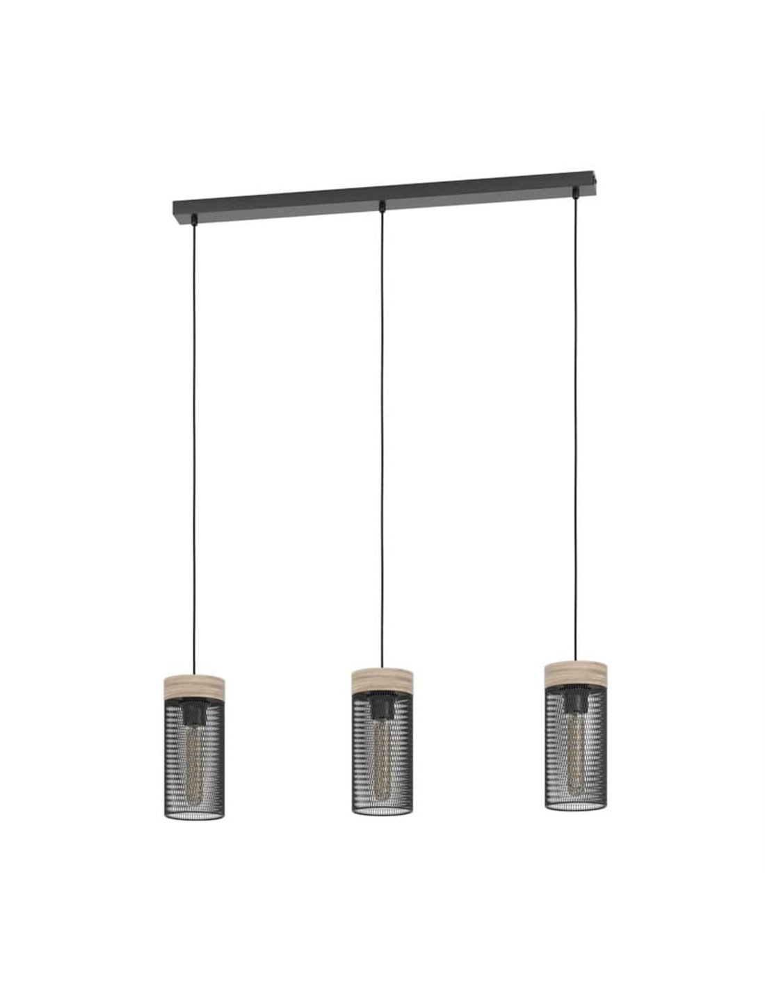 Die Pendelleuchte KILNSDALE mit 3 Lichtern von Eglo verbindet industrielles Design mit rustikalen Akzenten. Ihre drei schwarzen Metallnetzscreens ermöglichen eine einzigartige Lichtstreuung, die einladende Atmosphären schafft. Die Details aus natürlichem Holz verleihen dem Ganzen Wärme. Kompatibel mit E27-Glühbirnen ist sie ideal, um Esszimmer, Kücheninseln oder gewerbliche Räume zu beleuchten, die nach einer vintage-industriellen Ästhetik suchen.