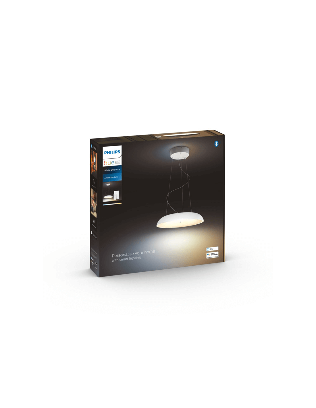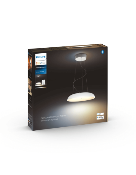 Die Integration eines Hue Bridge in die weiße Pendelleuchte Amaze ermöglicht es dir, die breite Welt der Möglichkeiten der intelligenten Beleuchtung zu entdecken. Was die Abmessungen angeht, so beträgt die maximale Höhe 150 cm, die Länge 43,4 cm und das Netto-Gewicht 2,87 kg.