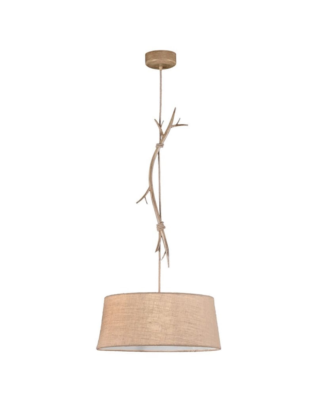 Die rustikale Pendelleuchte der Sabina-Serie von Mantra besteht aus einem Textilschirm aus Jute. Der Schirm wird von einem mit Textil überzogenen Kabel gehalten, das Seil imitiert. Um einen einzigartigen Akzent zwischen der Deckenbasis und dem Schirm zu setzen, enthält diese Lampe ein Metallelement, das Holz mit Spänen imitiert und mit 2 Knoten am Kabel befestigt ist.