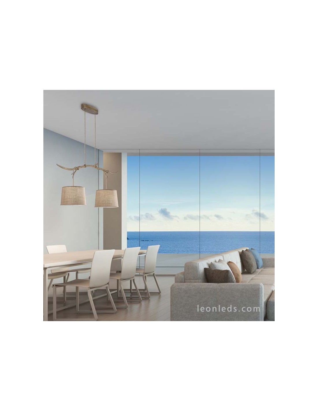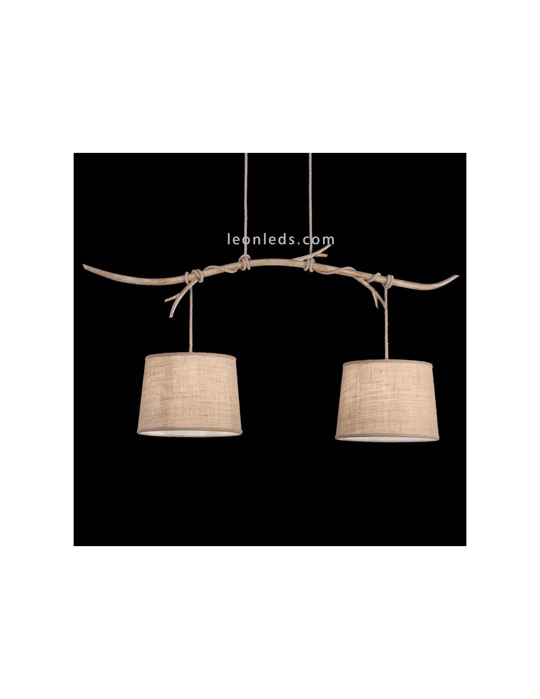 Die rustikale Pendelleuchte der Sabina-Serie von Mantra besteht aus zwei Schirmen aus Jute. Die Schirme sind durch ein Kabel gehalten, das mit Textil überzogen ist und das Seil imitiert. Um einen einzigartigen Akzent zu setzen, führen aus der Deckenbasis zwei mit Textil überzogene Kabel, die ein Metallelement imitiert, das aussieht wie ein Baumast; das Kabel hängt von diesem Element und hält die Schirme.