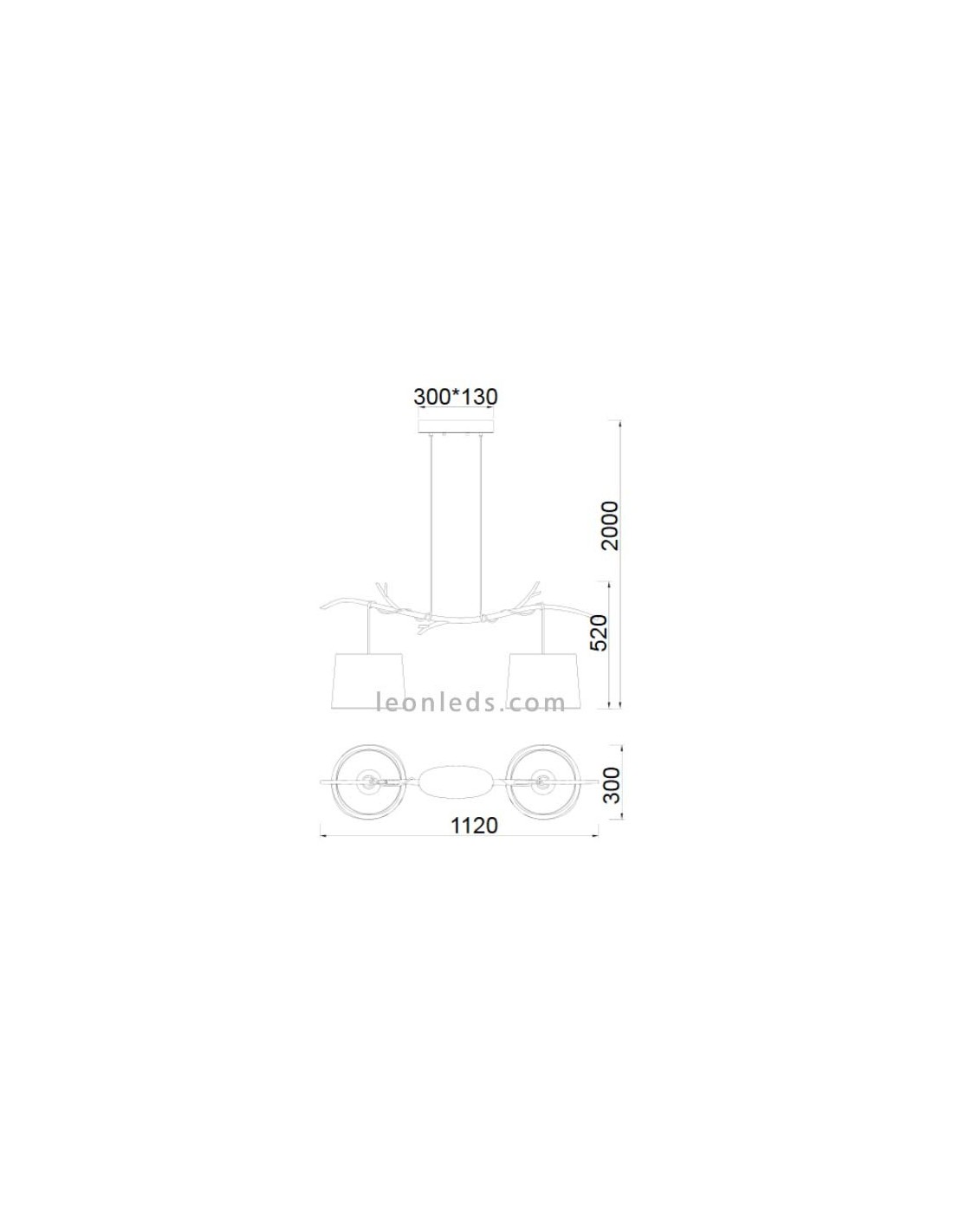 Die Lampe hat zwei Schirme mit einem Durchmesser von 30CM und kann in der Höhe von 52CM bis zu 2 Metern reguliert werden. Die Deckenbasis hat einen Durchmesser von 30x13CM. Diese Lampe hat eine Breite von 112CM.