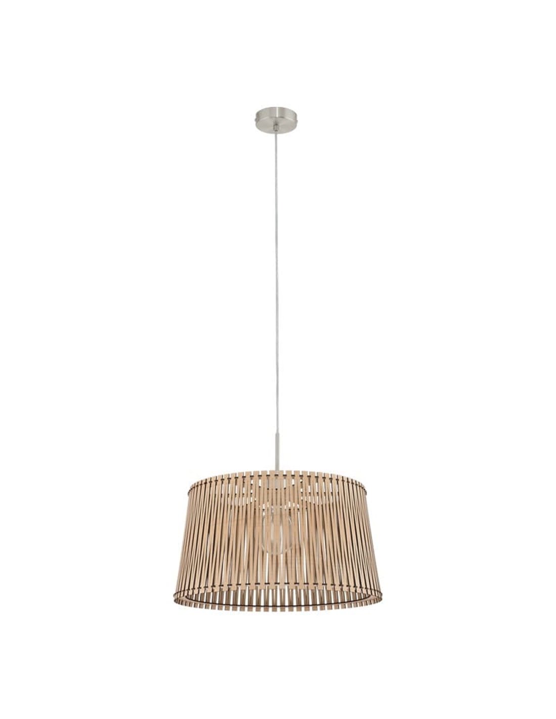 Pendelleuchte SENDERO in gebürsteter Nickel + Ahorn mit E27 Fassung. Schutz IP20 und Materialien Stahl und Holzbretter (Ahorn). Abmessungen: Ø 45,0 cm | Gesamthöhe 130,0 cm. Ideal für Wohnzimmer, Esszimmer, Schlafzimmer (EGLO).