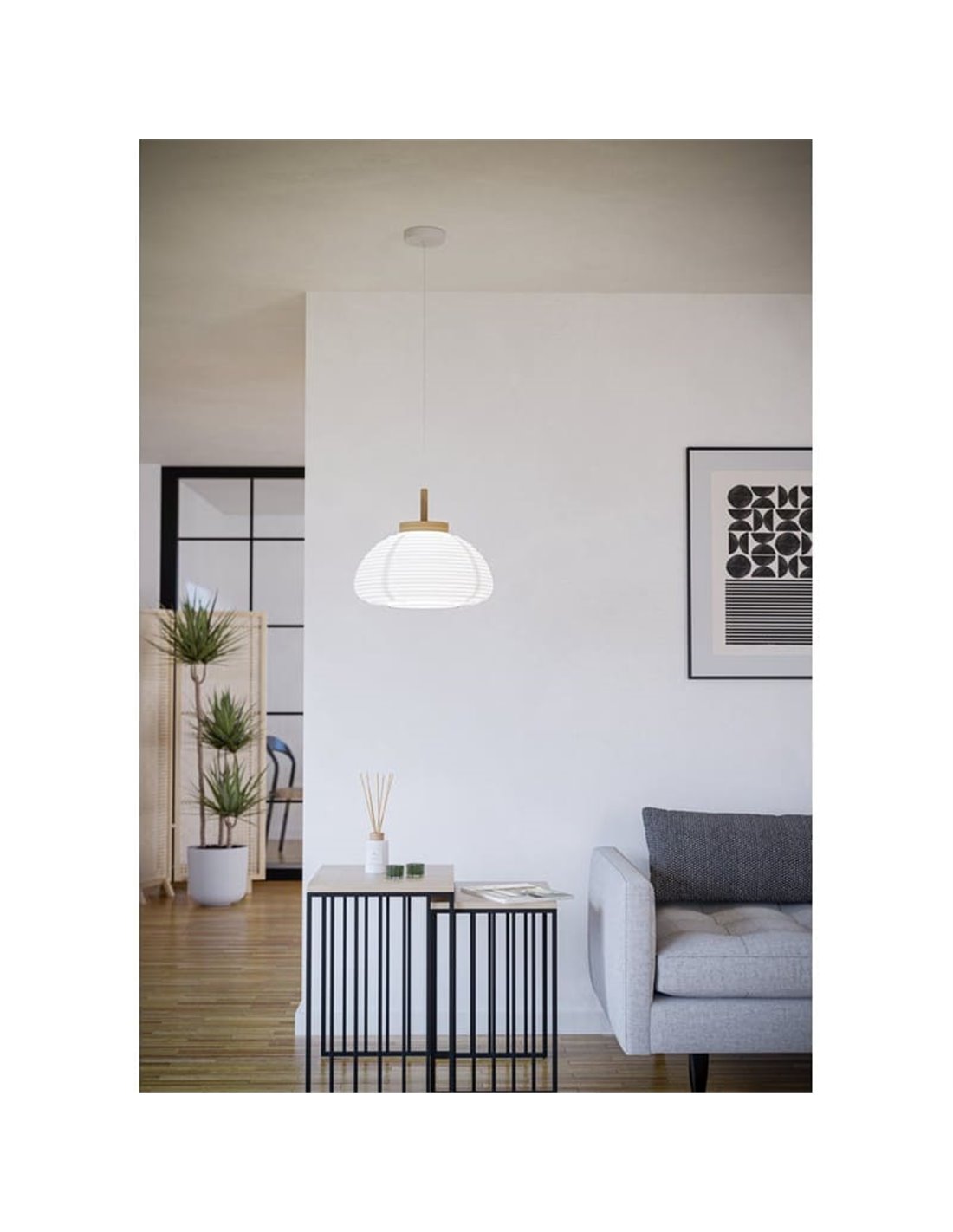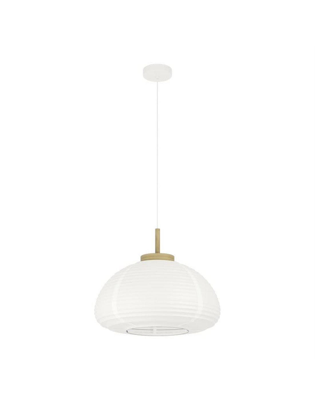 Pendelleuchte SUMMERHILL von Eglo mit weißem Papierschirm und Holzelementen. Durchmesser 55 cm. Kompatibel mit E27-Glühbirnen (nicht enthalten). Perfekt zur Beleuchtung großer Räume mit einem natürlichen und modernen Akzent.