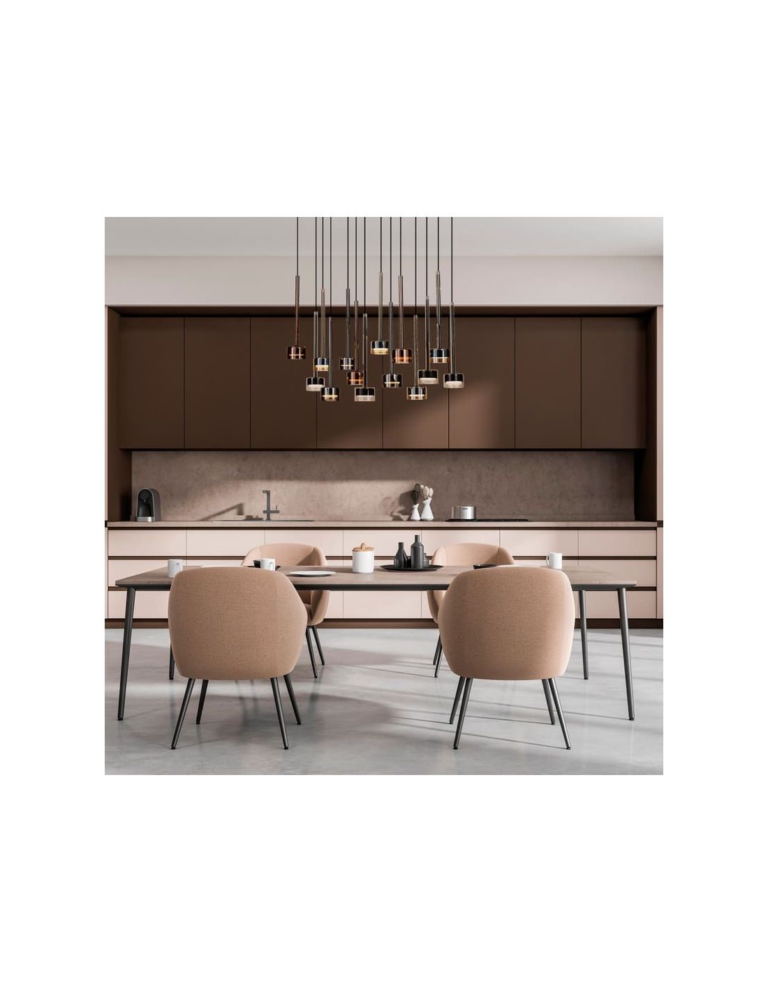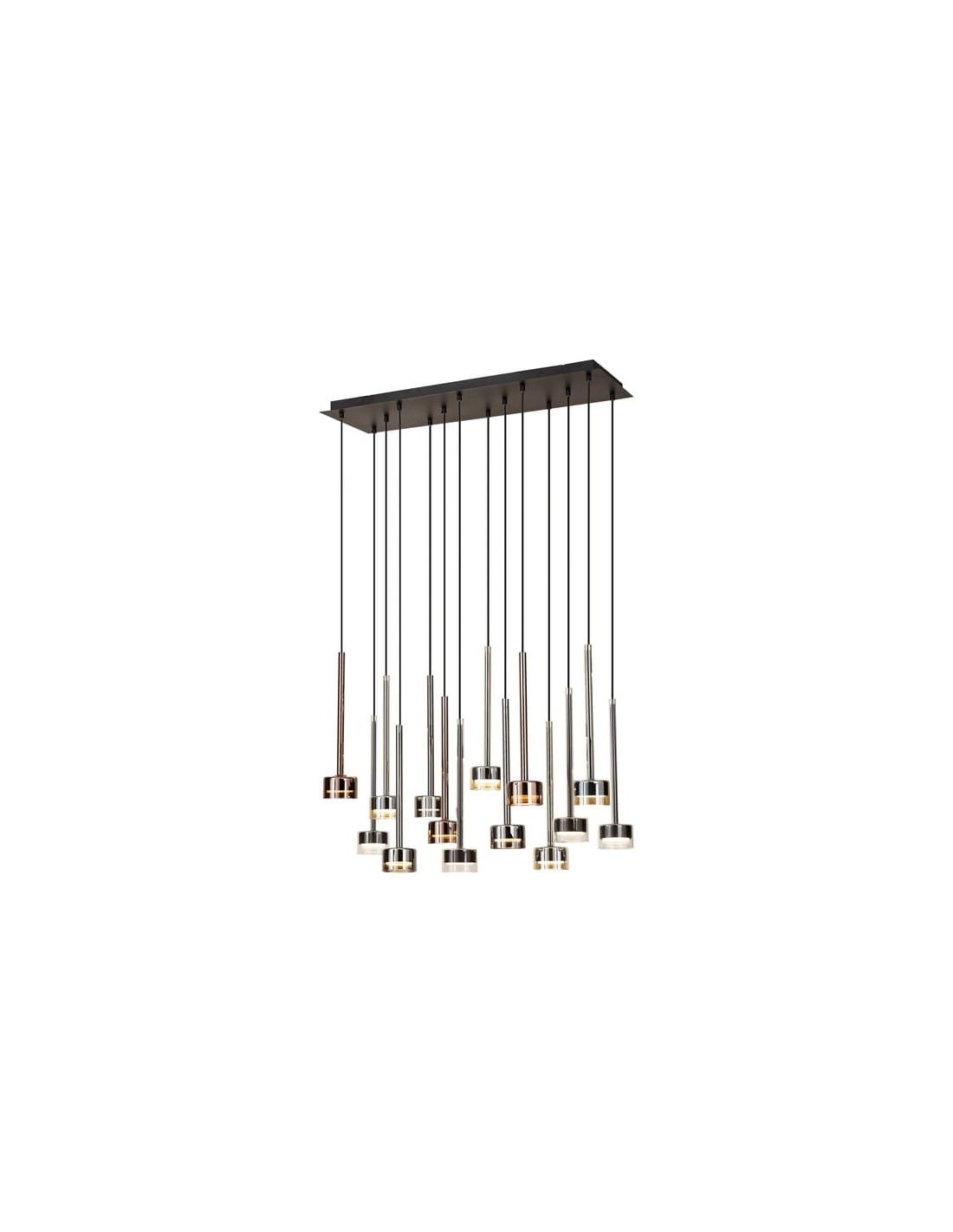 Tauchen Sie ein in ein Lichtspiel mit der Pendelleuchte TONIC mit 14 Lichtern in quadratisch GX53. Mit mehrfarbigem Glas (transparent, Chrom, Bronze, Kupfer) hebt diese 90 cm breite und 200 cm hohe Lampe die Eleganz und Vitalität jedes Raumes hervor.