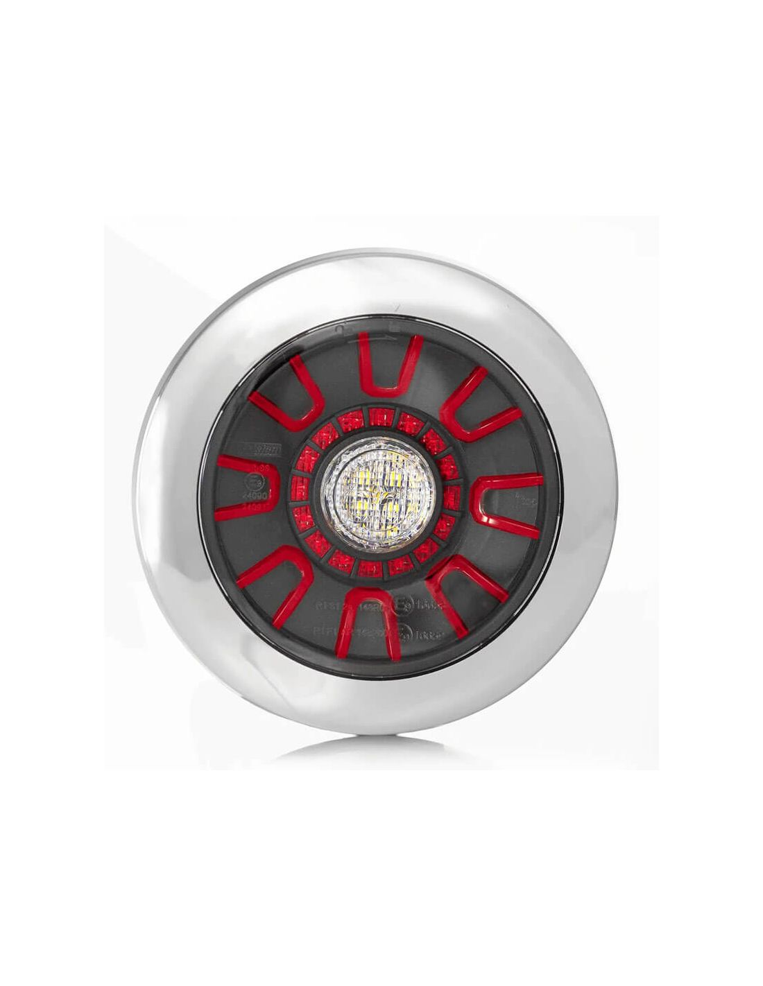 Rundes LED-Rücklicht mit chromiertem Ring zur eingebauten Installation, mit modernem und innovativem Design, für Installationen von 12V und 24V geeignet, homologiert und vollständig tauchfähig, mit 2 Jahren Garantie. Preis pro Stück, ohne Halter.