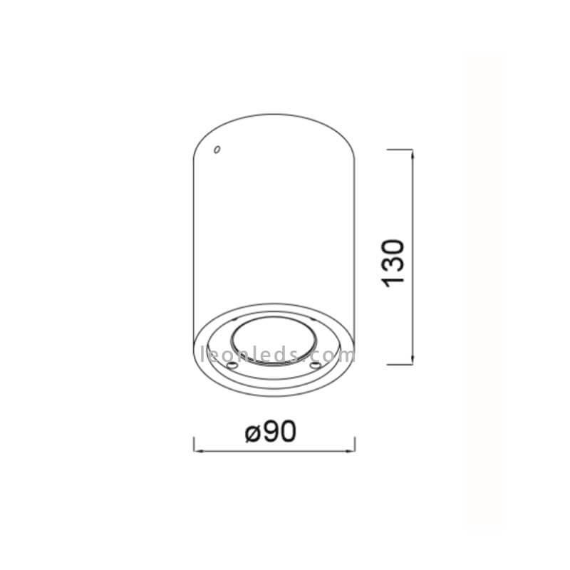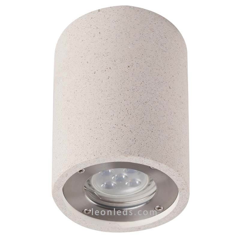 Rund Außenplatte zur Installation an einer Außendecke erhältlich in Dunkelgrau und Weiß, mit einer Struktur aus Beton, im Inneren hat er eine Fassung zur Installation von 1 GU10 LED-Lampe (nicht enthalten). Diese runde Außenplatte hat eine Höhe von 13 cm und einen Durchmesser von 9 cm und wird flach an einer Außendecke installiert.