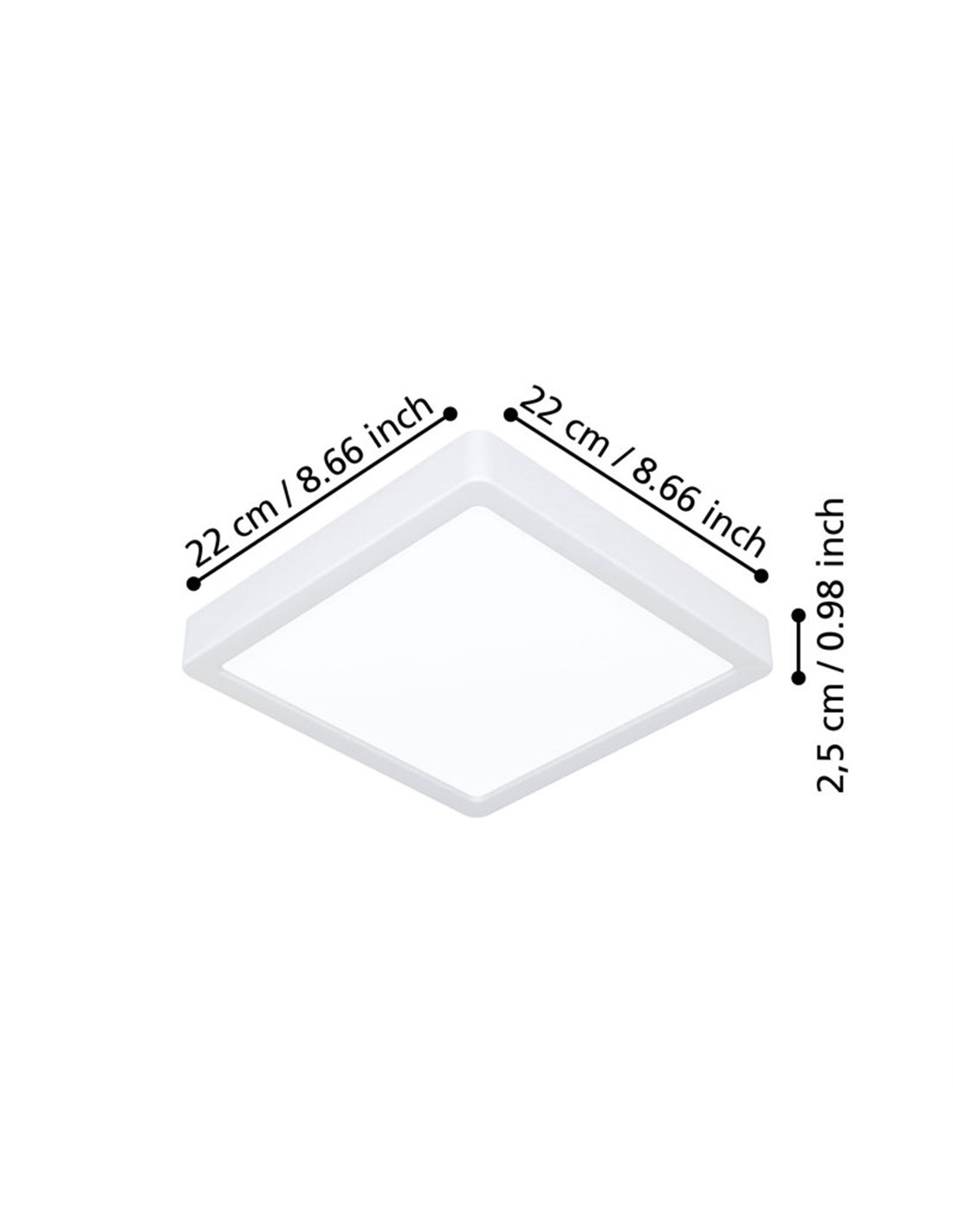 Der quadratische weiße LED-Oberflächenplafond FUEVA 6 220×220mm, 10,5W 1200Lm, CCT (2700K-4000K-6500K), IP20 gehört zur FUEVA 6 Serie von EGLO und fungiert als Oberflächenplafond für Innenräume. Sein ultraflaches Design (28 mm) und der satinierte Diffusor garantieren ein gleichmäßiges Licht ohne Blendung.