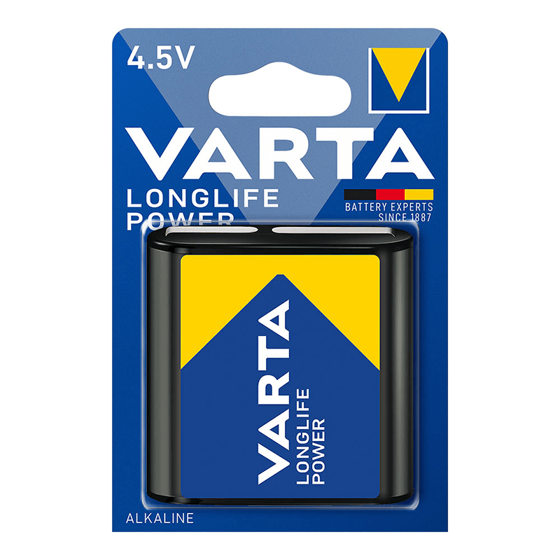 4.5V Alkali-Batterie Modell 3LR12 der Marke Varta, gehört zur Long Life Power-Serie, die eine lange Lebensdauer im Vergleich zu anderen Alkali-Batterien bietet, bekannt als Pocket-Batterie.
