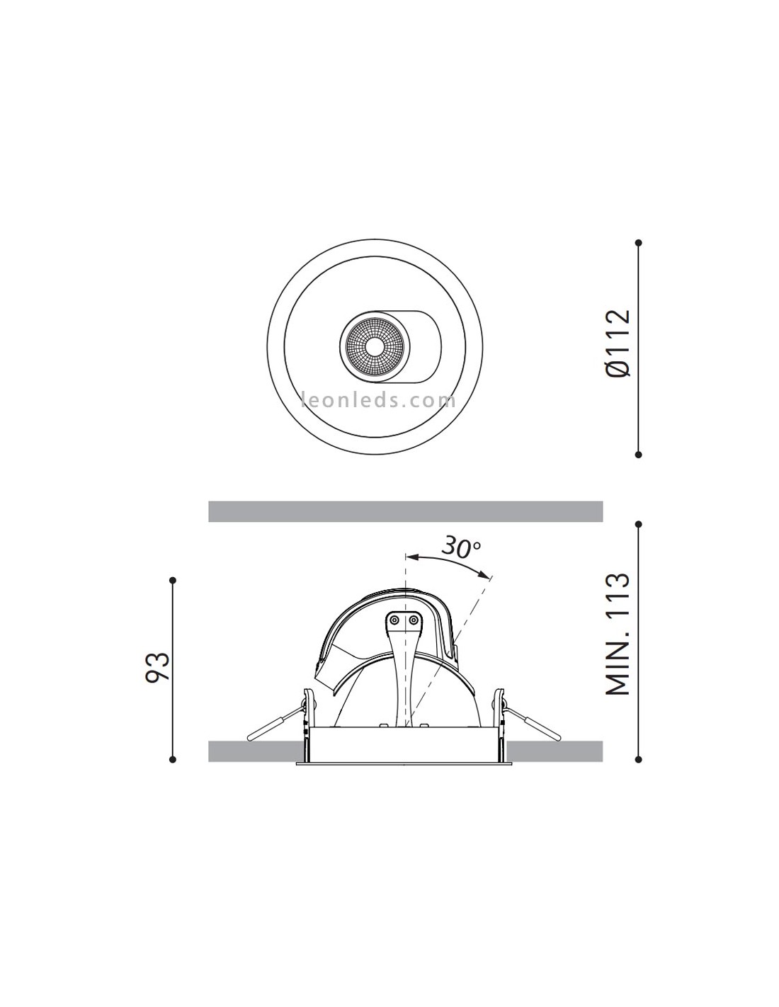Dieser orientierbare LED-Einbaustrahler hat einen Schnittdurchmesser von 105mm, einen Außendurchmesser von 112mm, eine Höhe von 93mm und eine minimale Installationshöhe von 113mm.