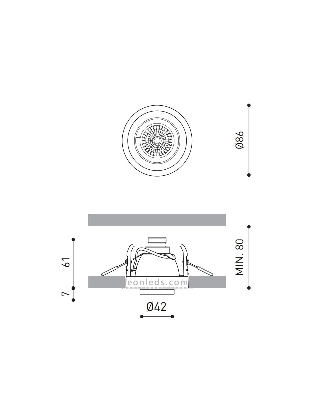 Dieser LED Strahler oder Einbaustrahler hat einen Ausschnittdurchmesser von 79mm, einen äußeren Durchmesser von 86mm, eine Gesamthöhe von 61mm und eine minimale Installationshöhe von 80mm. Die Linse hat einen Durchmesser von nur 42mm.
