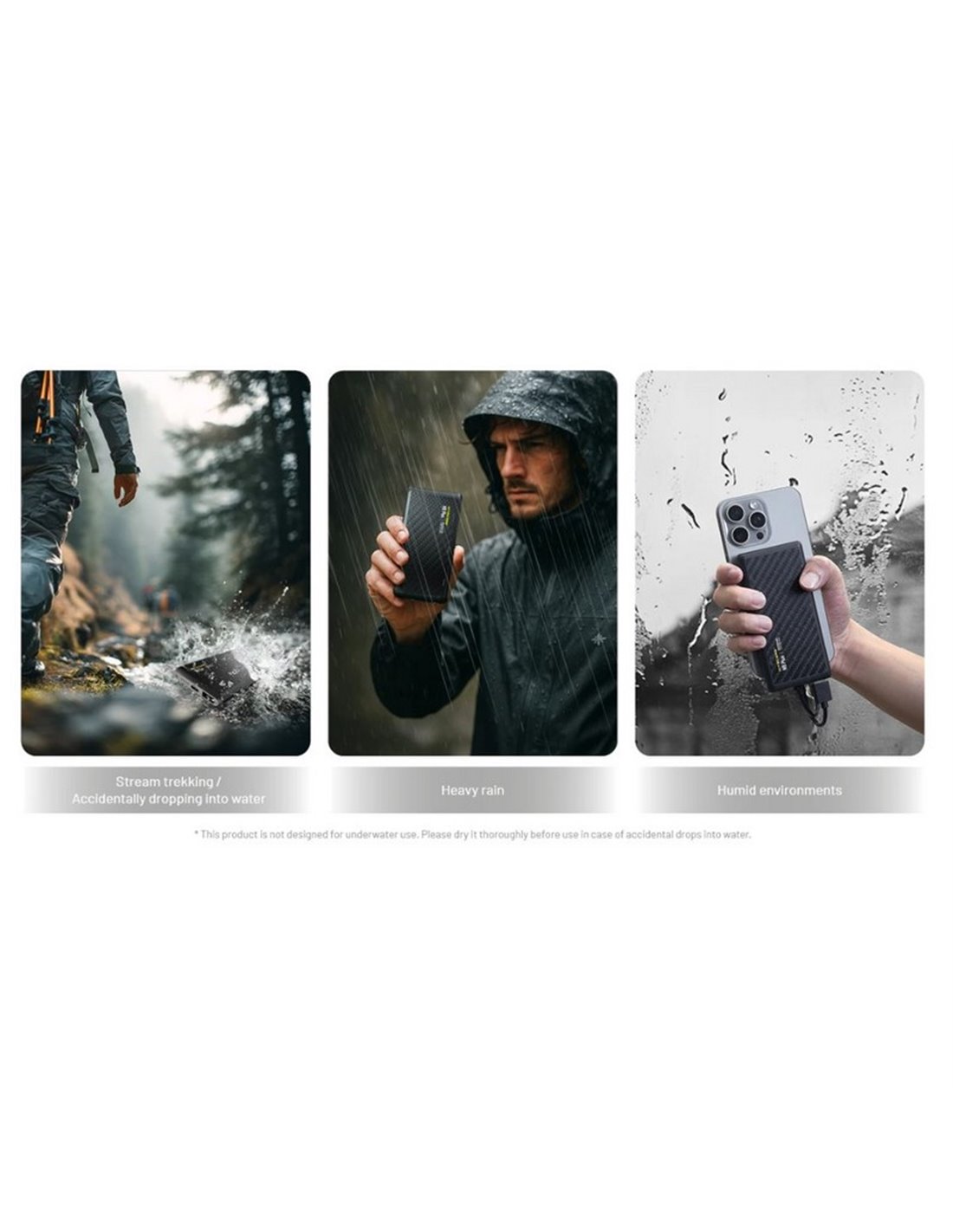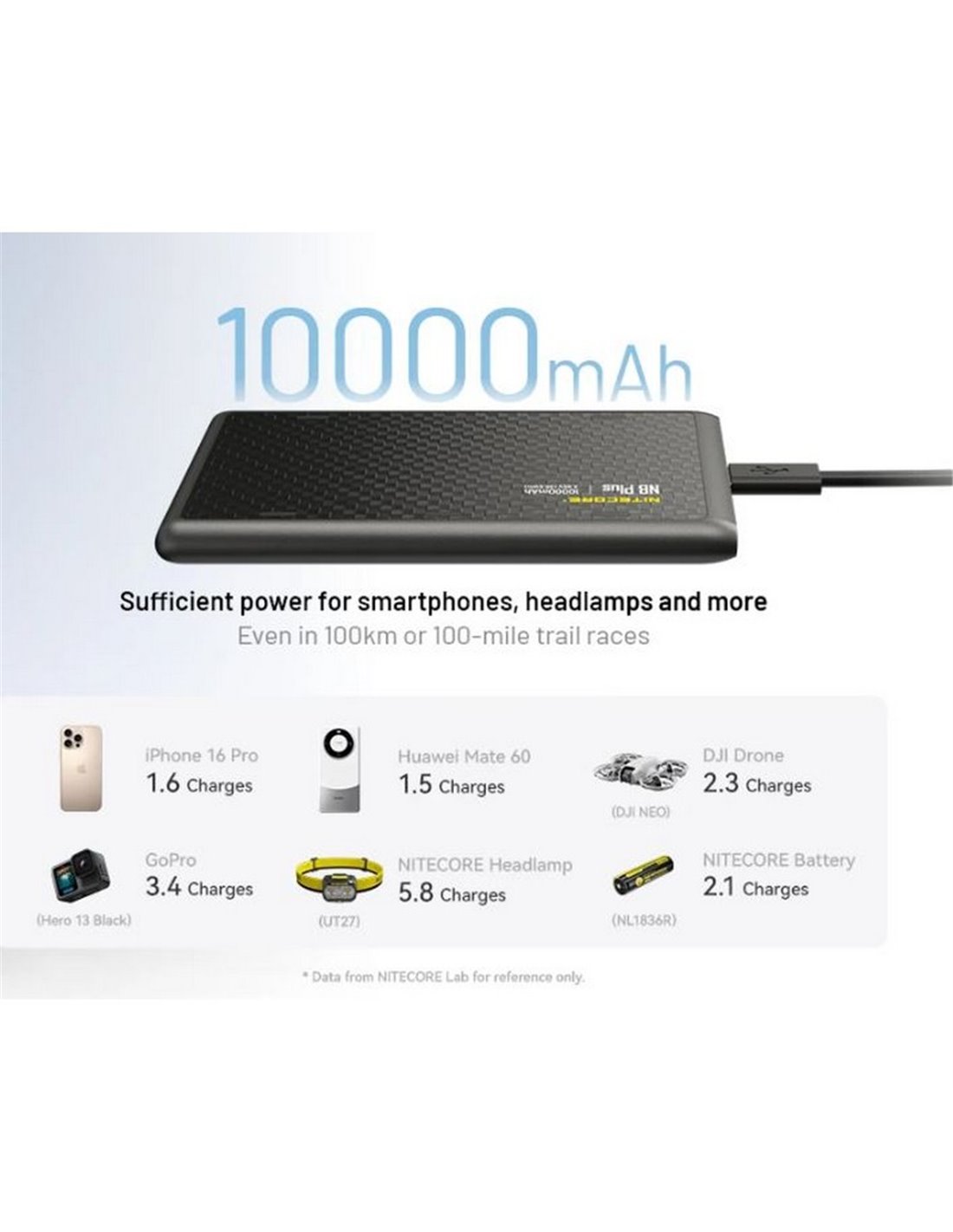 Powerbank NB Plus mit 10.000 mAh Li-ion Akku. Schnellladung USB-C 22,5 W, IPX7 Schutz, 155 g, kompaktes und leichtes Design.