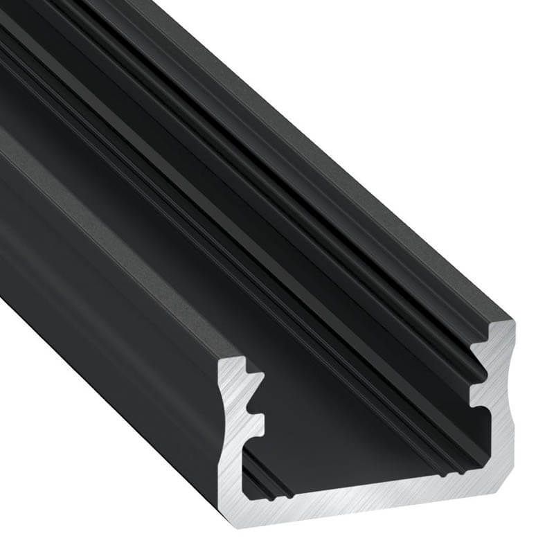 Profil Typ A aus hochwertigem, rohem Aluminium mit schwarzer Oberfläche, entworfen für die Montage von LED-Streifen auf der Oberfläche. Dieses Aluminiumprofil ist ideal für dekorative Beleuchtung in Möbeln und Innenverkleidungen mit indirektem Licht.