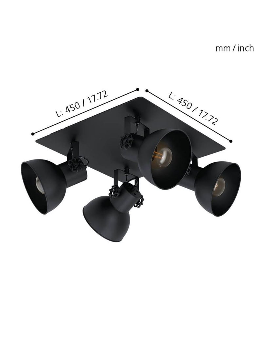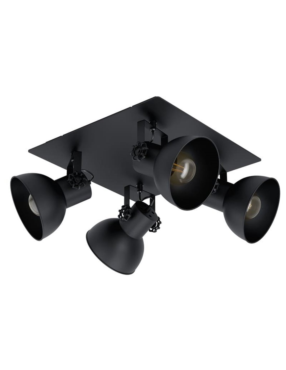 Deckenleuchte BARNSTAPLE 1 aus schwarzem Metall mit vier drehbaren Köpfen, die es ermöglichen, das Licht nach deinem Geschmack zu ändern. Ideal für Küchen, Wohnzimmer, Schlafzimmer und Esszimmer. Kompatibel mit E27-Lampen (nicht enthalten). Bringe den industriellen Stil in dein Zuhause!