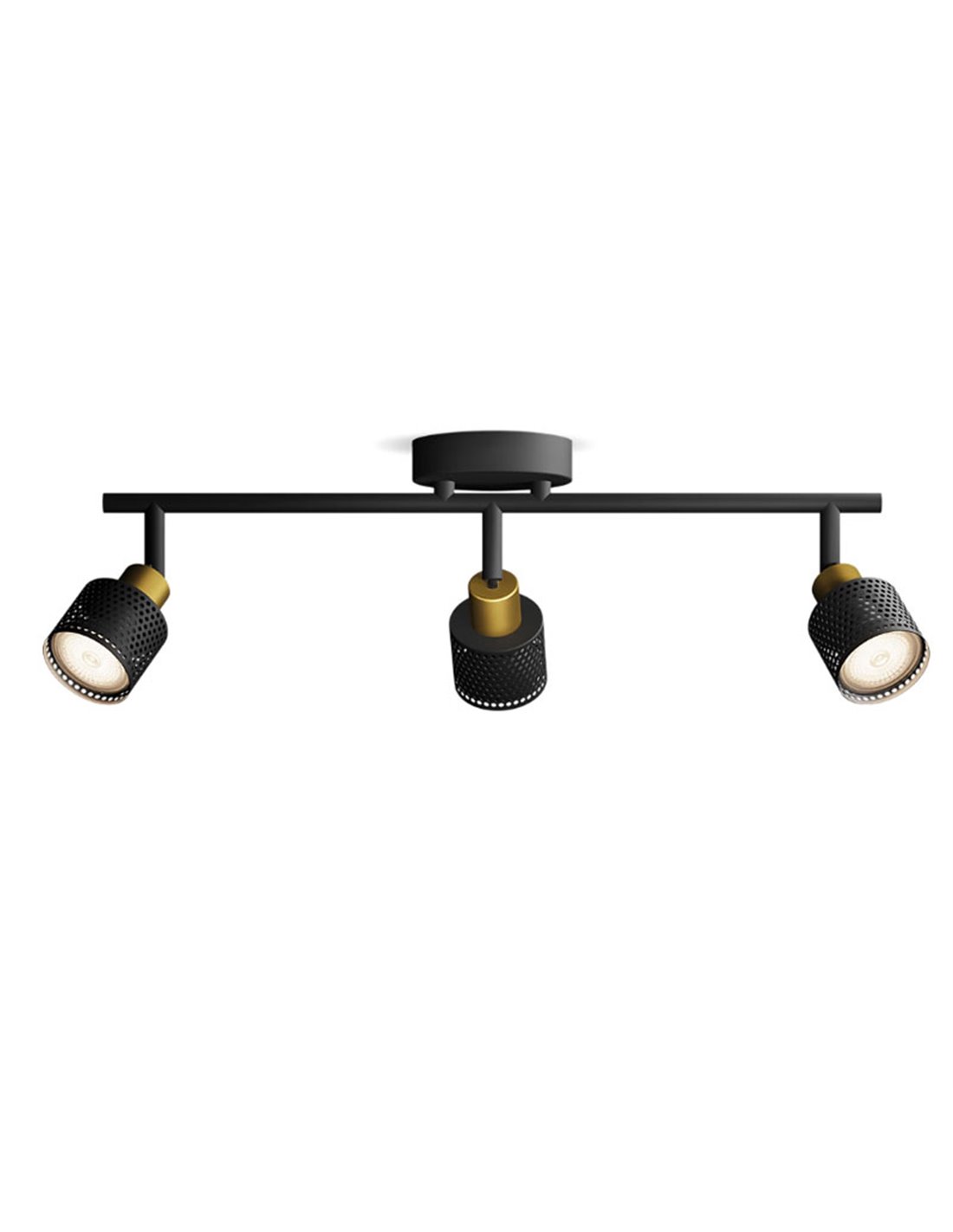 Der Regler mit 3 NIALL-Spotlights von Philips zeichnet sich durch sein elegantes und zeitgemäßes Design aus und ist ideal für alle, die einen industriellen Akzent in ihrer Dekoration suchen. Hergestellt aus schwarzem Metall mit Messingdetails, bietet dieser Regler optimale und gleichmäßige Beleuchtung für jeden Raum, wie Wohnzimmer, Küche, Schlafzimmer oder Flur.