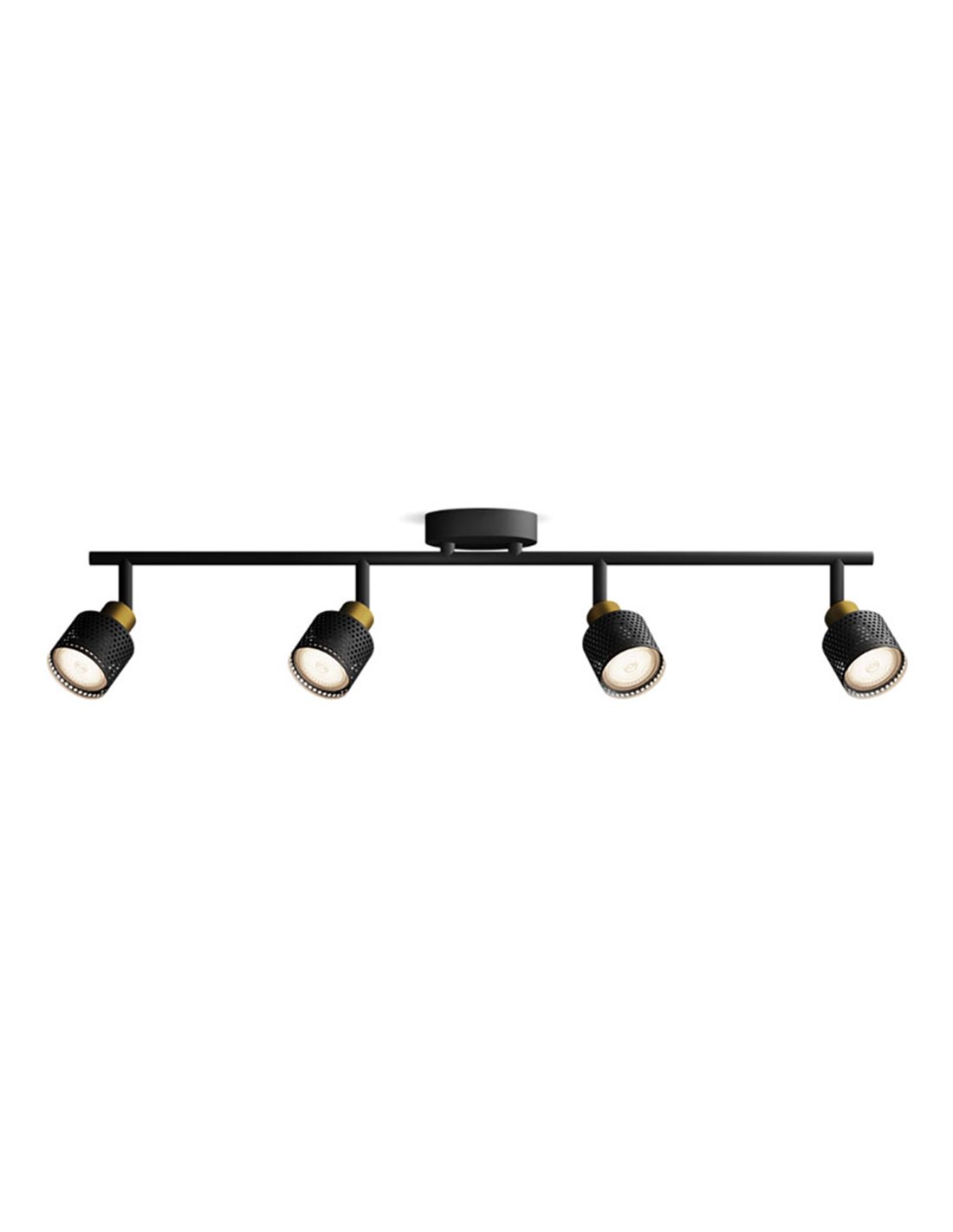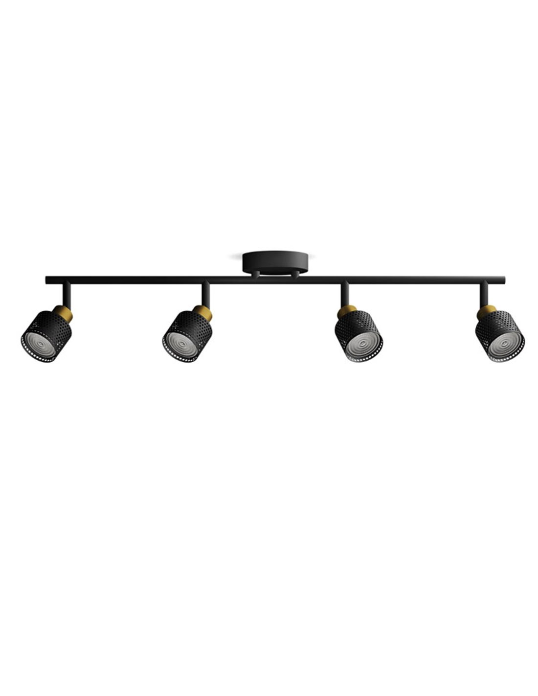 Regler mit 4 NIALL-Spotlights im perforierten Industriedesign, schwarz und Messing, 4xGU10 (Nicht inkl.) - Modernes Design mit perforiertem Finish und Messingdetails, perfekt um jedem Raum Eleganz zu verleihen. Inklusive ClickFix-Montagesystem.