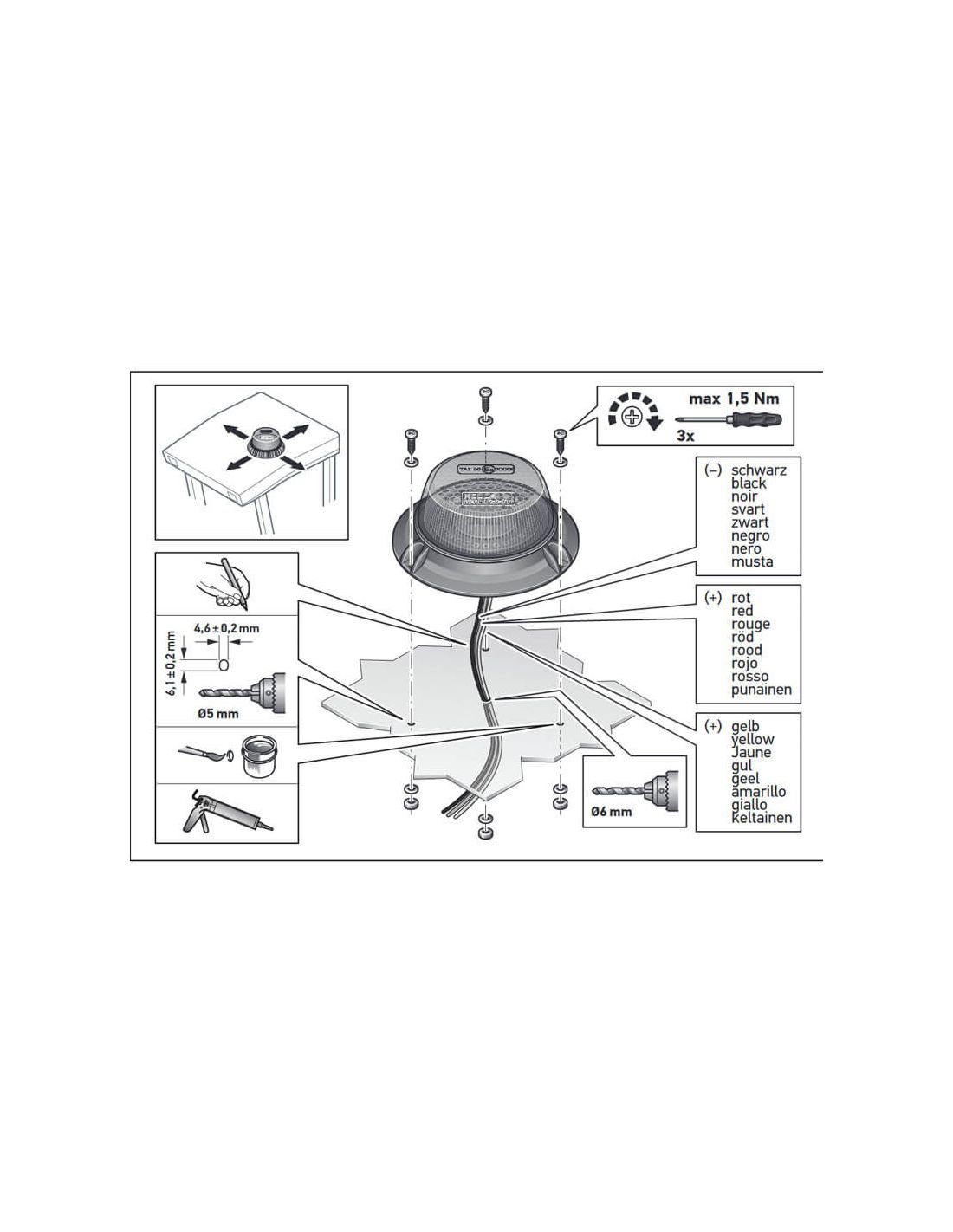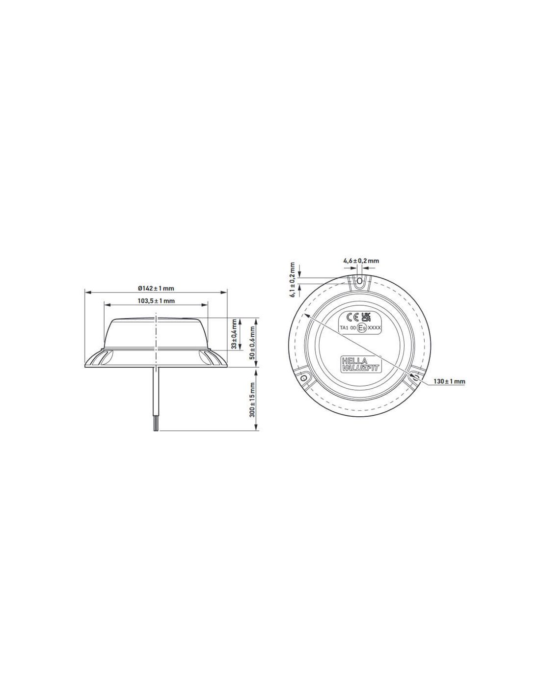 Rotierender LED-Magnetscheinwerfer ValueFit von Hella in Amberfarbe geeignet für 12V und 24V mit der Zulassung ECE-R65 TA1/ECE-R10 EMC/SAE J845 Klasse 1, kann magnetisch befestigt oder mit Schrauben fixiert werden, enthält 30 cm Kabel für den Anschluss. Die Maße sind auf einem der Fotos sichtbar.