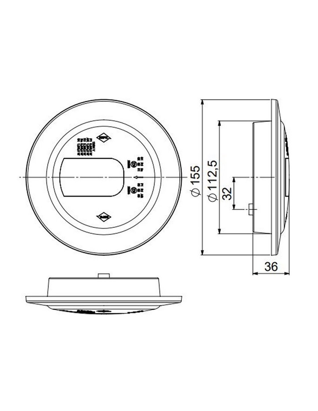 Abmessungen: Außendurchmesser 155 mm, Montagedurchmesser 112,5 mm, Tiefe 36 mm.