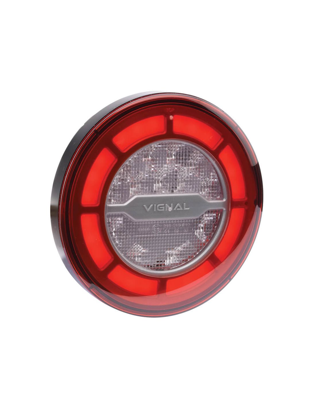 LED-Rücklicht Vignal LCR19 24V mit Funktionen von glowenden Position, Blinker und Bremslicht, mit integriertem Widerstand und 2 zusätzlichen Steckern. OEM Schmitz und Ferruz, IP69K, Ø140 mm, AMP MCP 4-Pin-Verbindung. Dieses Modell zeigt keinen Lampenausfall an.