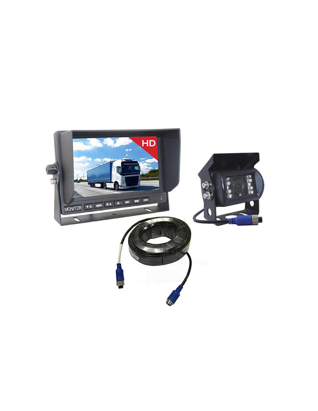 HD-Rückfahrkamera-System komplett und kabelgebunden mit 7” AHD-Bildschirm, ideal für Lkw, Busse, Transporter und Spezialfahrzeuge. Es ermöglicht den Anschluss von bis zu 3 Kameras.