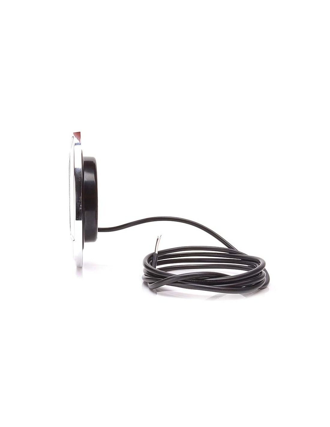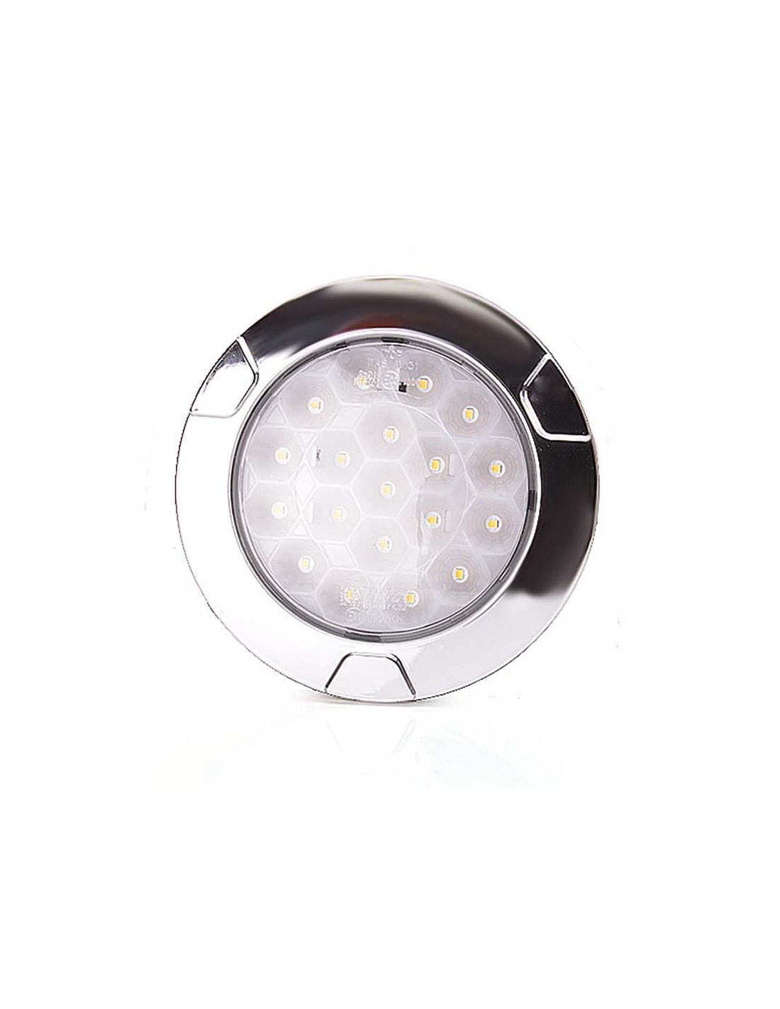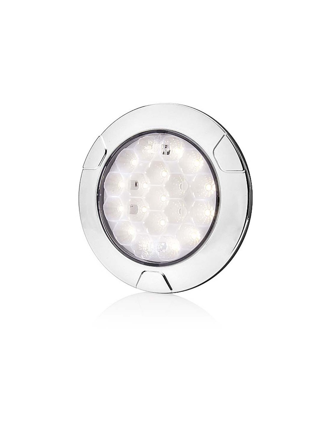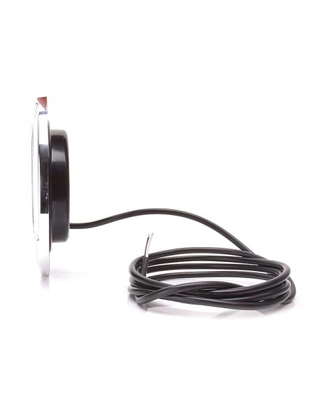 Genehmigtes Rückfahr-LED-Licht in runder Form, enthält 2 Meter Kabel für die Installation und ist geeignet für 12 und 24 Volt-Anlagen, verfügt über einen chromfarbenen Ring und wird eingebaut installiert.