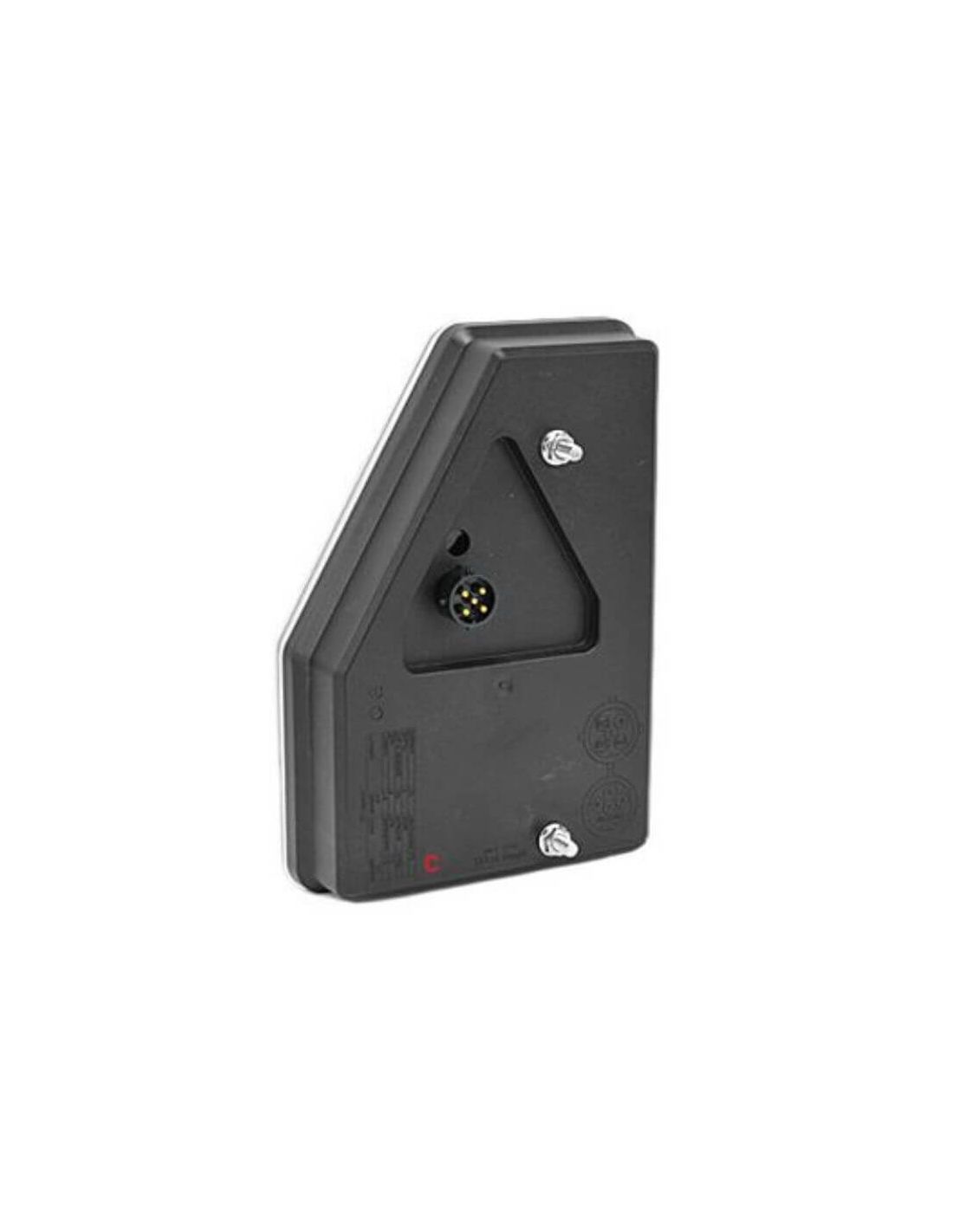 Funktionen: Position, Blinker, Bremslicht (linke Seite), Nebellicht und (rechte Seite) Rückfahrlicht und reflektierendes Dreieck (Kategorie IIA), es hat kein Nummernschildlicht.